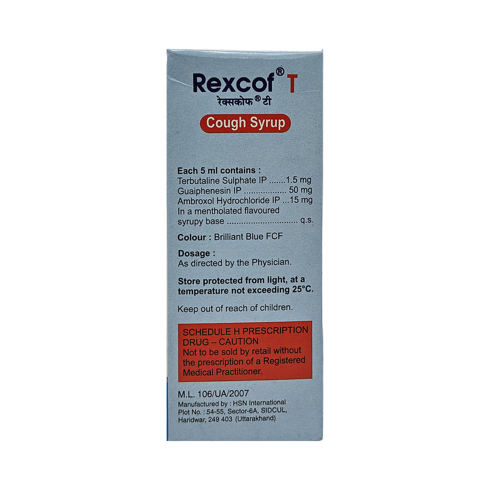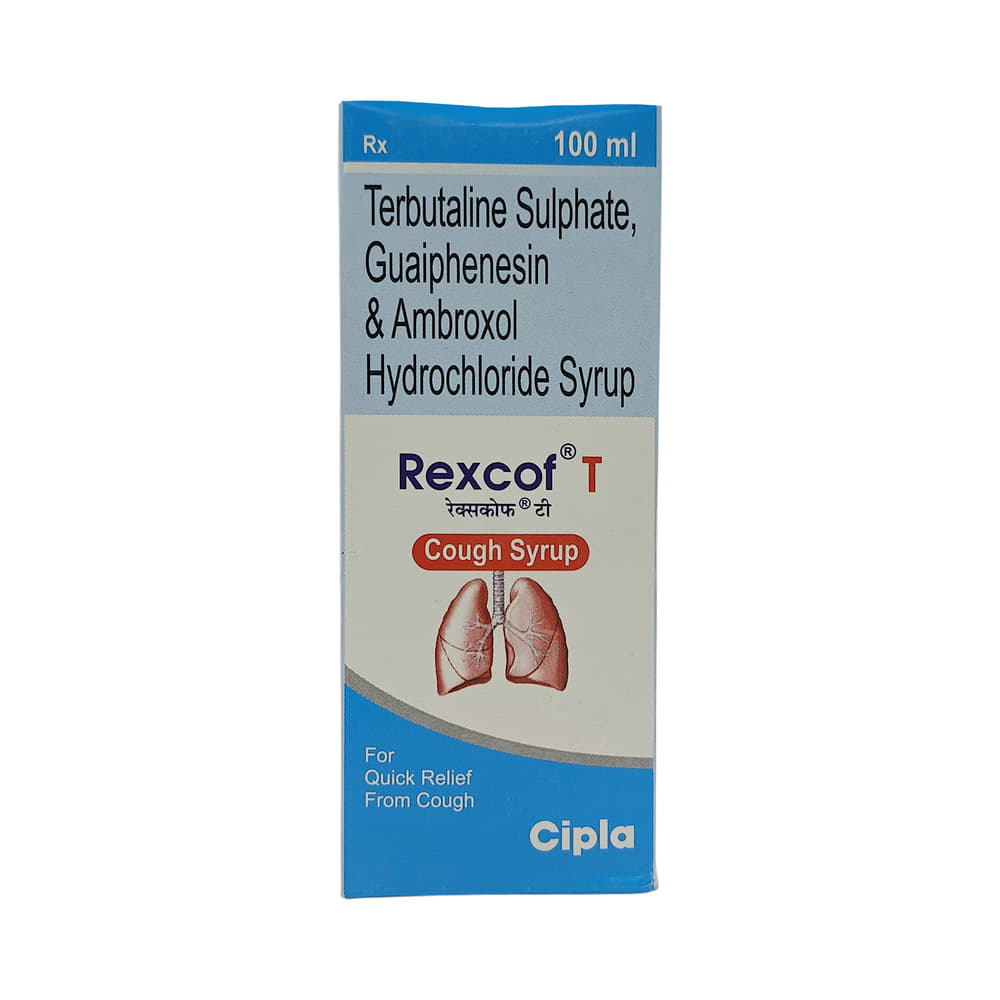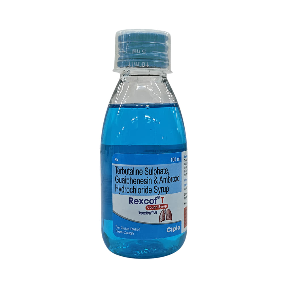 Rexcof T Syrup is a combination of four medicines: Terbutaline, Ambroxol, Guaifenesin and Flavoured Mentholated base which relieve cough with mucus. Terbutaline is a bronchodilator. It works by relaxing the muscles in the airways and widens airways. Ambroxol is a mucolytic which thins and loosens mucus (phlegm), making it easier to cough out. Guaifenesin is an expectorant which decreases the stickiness of mucus (phlegm) and helps in its removal from the airways. Flavoured Mentholated base produces a cooling sensation and relieves minor throat irritation.