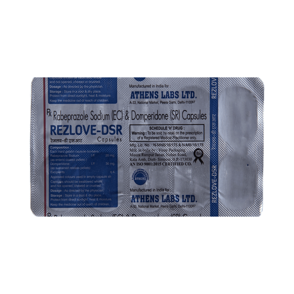 In Treatment of Gastroesophageal reflux disease (Acid reflux)Gastroesophageal reflux disease (GERD) is a chronic (long-term) condition in which there is an excess production of acid in the stomach. Rezlove-DSR Capsule reduces the amount of acid your stomach makes and relieves the pain associated with heartburn and acid reflux. You should take it exactly as it is prescribed for it to be effective. Some simple lifestyle changes can help reduce the symptoms of GERD. Think about what foods trigger heartburn and try to avoid them; eat smaller, more frequent meals; try to lose weight if you are overweight, and try to find ways to relax. Do not eat within 3-4 hours of going to bed.In Treatment of Peptic ulcer diseasePeptic ulcer disease is a condition in which painful sores or ulcers develop in the inner lining of the stomach or gut (intestine). Rezlove-DSR Capsule reduces the amount of acid your stomach makes which prevents further damage to the ulcer as it heals naturally. You may be given other medicines along with this medicine depending on what caused the ulcer. You need to keep taking the medicine as it is prescribed for it to be effective, even if the symptoms seem to disappear.show moreshow less