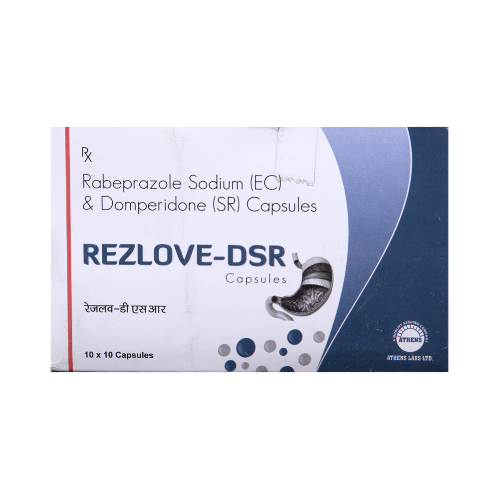 Rezlove-DSR Capsule is a combination of two medicines: Domperidone and Rabeprazole. Domperidone is a prokinetic that works on the upper digestive tract to increase the movement of the stomach and intestines, allowing the food to move more easily through the stomach. Rabeprazole is a proton pump inhibitor (PPI) which works by reducing the amount of acid in the stomach, which helps in the relief of acid-related indigestion and heartburn.