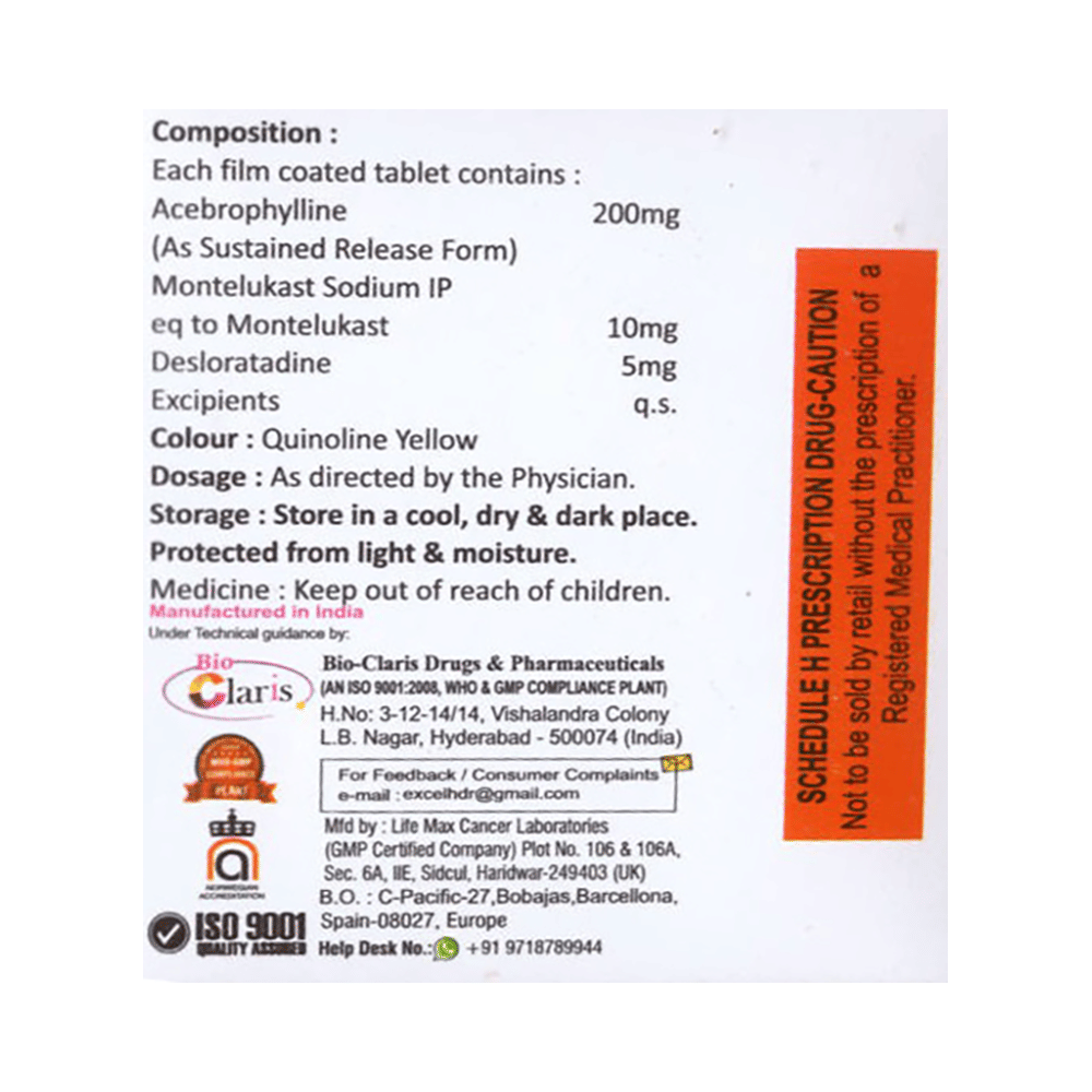 Salt Composition: Acebrophylline (200mg) + Desloratadine (5mg) + Montelukast (10mg)