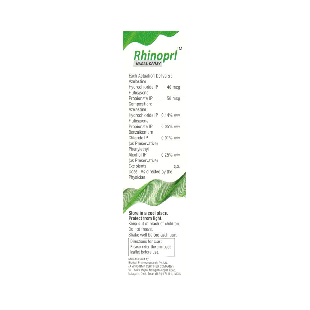 Rhinoprl Nasal Spray is a combination of two medicines: Fluticasone Propionate and Azelastine, which relieves sneezing and runny nose caused due to allergies (allergic rhinitis). Fluticasone Propionate is a steroid which works by blocking the release of certain chemical messengers that cause inflammation (swelling) and irritation in the nose. Azelastine is an antiallergic which relieves allergy symptoms like runny nose, watery eyes and sneezing.