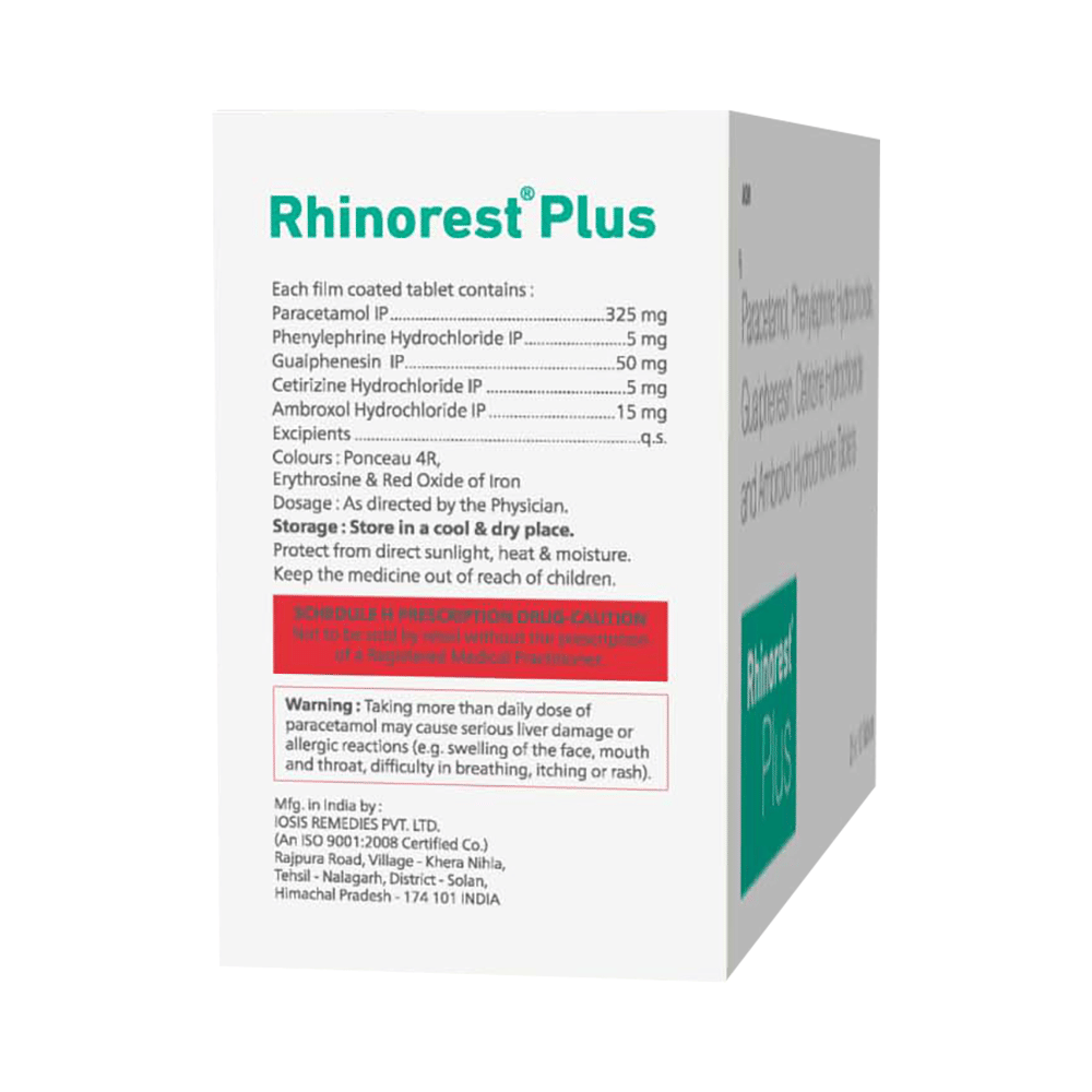 In Common coldRhinorest Plus Tablet is a combination medicine that effectively relieves symptoms of the common cold, such as a blocked nose, runny nose, watery eyes, sneezing, and congestion or stuffiness. It helps loosen thick mucus, making it easier to cough out. It also shrinks the blood vessels and provides rapid relief that lasts for several hours. These actions make breathing easier. Rhinorest Plus Tablet is safe and effective. It usually starts to work within a few minutes, and the effects can last up to several hours. Take it as prescribed by your doctor, and do not stop using it unless you are advised otherwise.