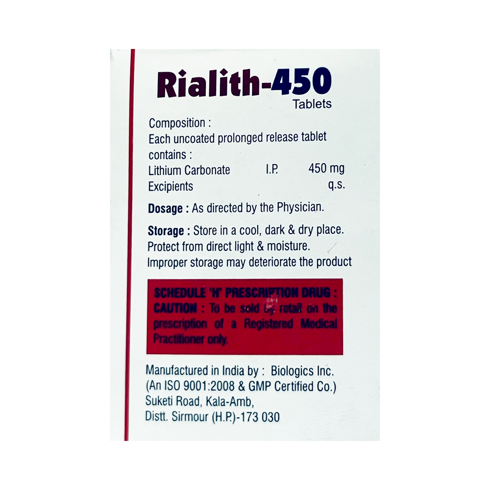 Rialith 450 Tablet PR is used in the treatment of bipolar disorder and mania in adults. It is sometimes used to treat other behavioral disorders as well. It reduces the frequency of manic episodes and decreases the intensity of those episodes that might occur. Rialith 450 Tablet PR should be taken with food. However, it is advised to take it at the same time each day as this helps to maintain a consistent level of medicine in the body. Do not skip any doses and finish the full course of treatment even if you feel better. If you have missed a dose, take it as soon as you remember it. You should continue to take this medicine for as long as the doctor advises and do not stop taking it suddenly as it may result in harmful effects.Side effects associated with the use of this medicine include tremors, slurred speech, uncoordinated body movements, nausea, Vomiting, acne, increased white blood cell count, and memory impairment. It may also cause hair loss, enlarged thyroid gland, skin rash, and increased thirst. This medicine may also cause weight gain and to control it, you should have a balanced diet and exercise regularly. If you have been taking this medicine for a long time then regular monitoring of thyroid and kidney function may be required.