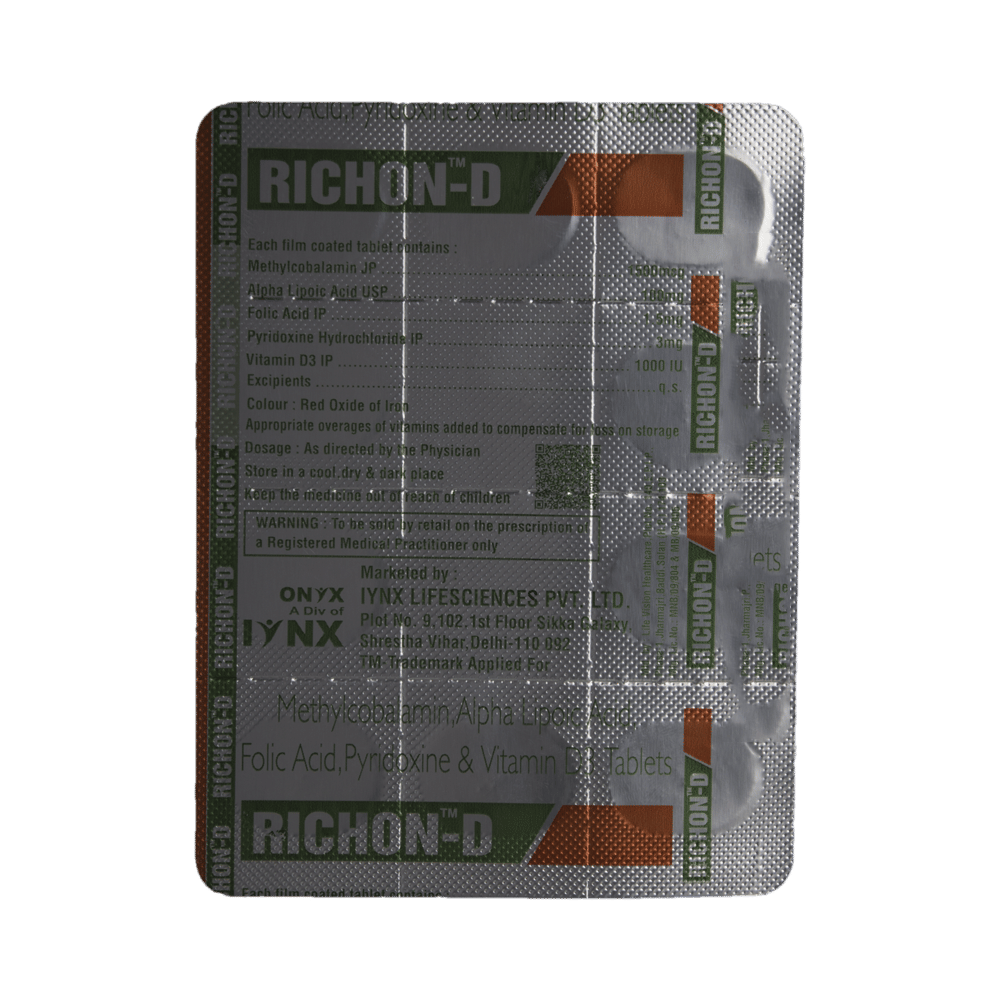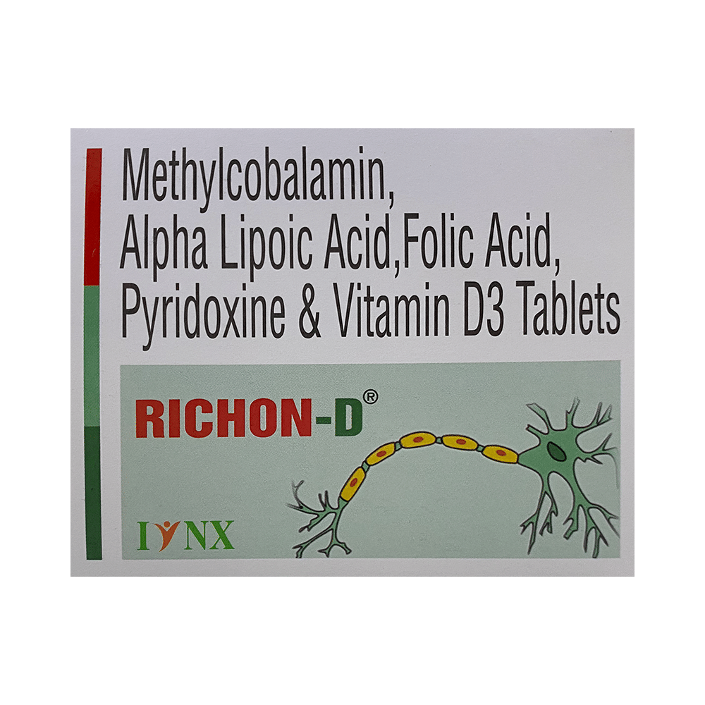 Richon-D Tablet is a combination of five nutritional supplements. Methylcobalamin is an active form of Vitamin B 12. This helps in proper cell growth and development, helps in protein synthesis and production of blood cells (red and white blood cells). Alpha Lipoic Acid is an antioxidant that repairs cell damage and restores vitamin level in the body, it also improves the functions of the nerves. Vitamin B6 (Pyridoxine) and Vitamin D3 are vitamin nutritional supplements that regulate essential metabolic functions in the body for proper growth and development. Folic Acid is also known as folate or vitamin B9. It helps in producing blood (hemoglobin) in the body. This is how it works in the treatment of nutritional deficiencies.