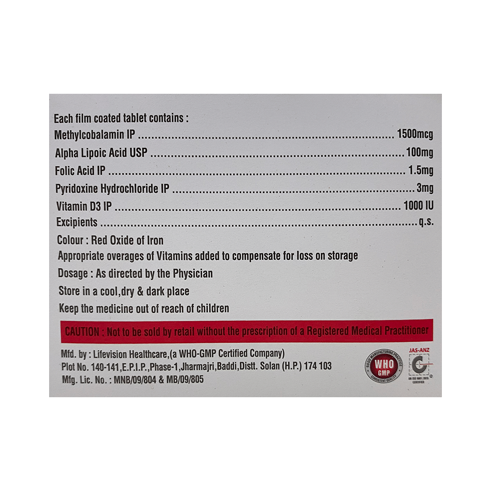Salt Composition: Methylcobalamin (1500mcg) + Alpha Lipoic Acid (100mg) + Vitamin B6 (Pyridoxine) (3mg) + Folic Acid (1.5mg) + Vitamin D3 (1000IU)