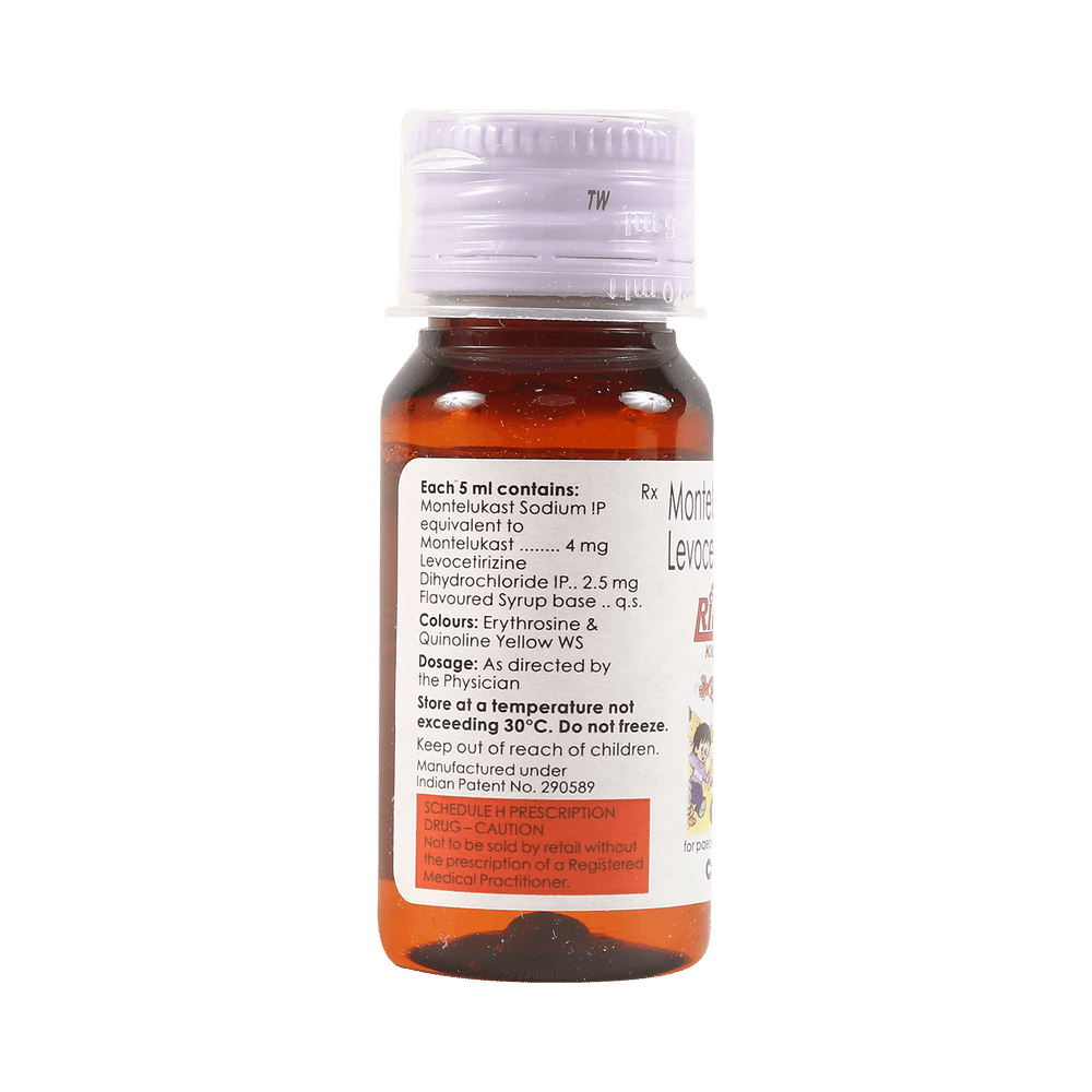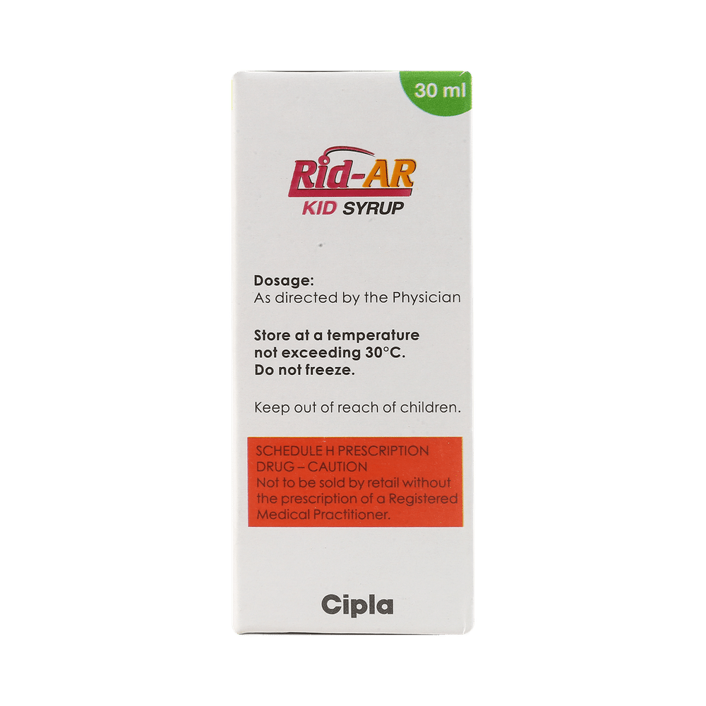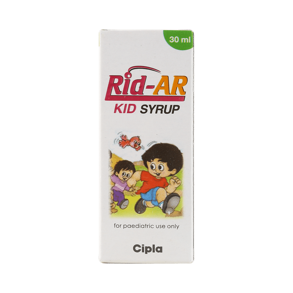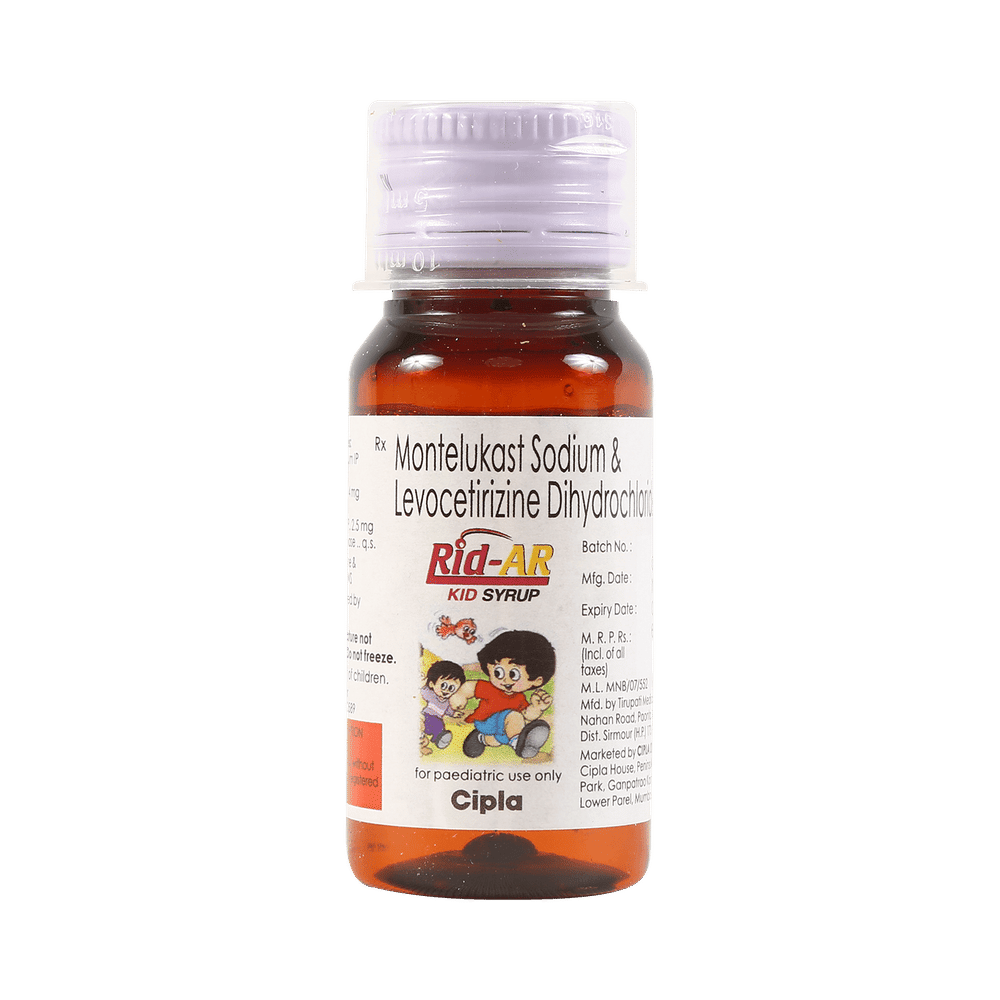 Rid-AR Kid Syrup is commonly prescribed in children to treat symptoms of allergy such as runny nose, sneezing, itching, swelling, congestion, and watery eyes. It may also help in the treatment of asthma and skin allergies. Give this medicine to your child at a fixed time before or after food in the prescribed dose, time, and way. For asthma, prefer giving Rid-AR Kid Syrup in the evening or 2 hours before physical activity. For allergy, it is best to give it either in the morning or in the evening, depending upon the time of onset of symptoms. In case your child has both, prefer giving it in the evening. If your child vomits within 30 minutes of taking this medicine, give the same dose again, but skip it if it’s already time for the next dose.Your child may start to feel better after a few regular doses. However, you must still complete the prescribed dose to ensure maximum benefit. Moreover, stopping the medicine abruptly may worsen your child’s condition. This medicine may cause some minor and temporary side effects like vomiting, diarrhea, nausea, dizziness, dry mouth, rash, and headache. Usually, these episodes subside once your child’s body adapts to the medicine. However, in case these effects persist or start bothering your child, consult your child’s doctor without any delay.Let your child’s doctor know if your child is already taking any medicines. Also, narrate your child’s complete medical history, including any prior episodes of allergy, heart problem, blood disorder, vascular disorders, birth defects, airway obstruction, lung anomaly, skin disorder, liver impairment, and kidney malfunction. This information is critical for dose alterations and in planning your child’s overall treatment.
