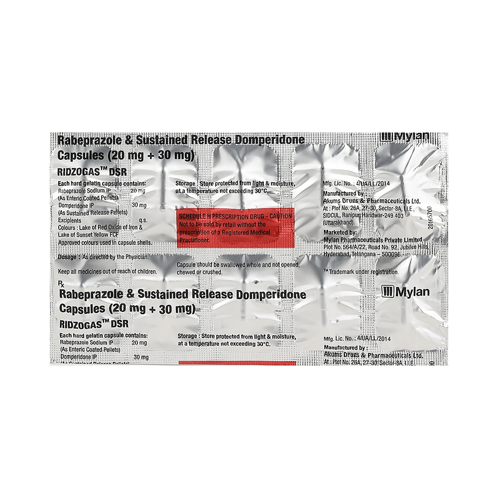 Ridzogas DSR Capsule is a combination medicine used to treat gastroesophageal reflux disease (acid reflux). It works by relieving the symptoms of acidity such as heartburn, stomach pain, or irritation. It also neutralizes the acid and promotes easy passage of gas to reduce stomach discomfort. Ridzogas DSR Capsule is taken without food in a dose and duration as advised by the doctor. The dose you are given will depend on your condition and how you respond to the medicine. You should keep taking this medicine for as long as your doctor recommends. If you stop treatment too early your symptoms may come back and your condition may worsen. Let your healthcare team know about all other medications you are taking as some may affect, or be affected by this medicine.The most common side effects are diarrhea, stomach pain, dryness in the mouth, headache, flatulence, and weakness. Most of these are temporary and usually resolve with time. Contact your doctor straight away if you are at all concerned about any of these side effects. This medicine may cause dizziness and sleepiness, so do not drive or do anything that requires mental focus until you know how this medicine affects you. Avoid drinking alcohol while taking this medicine as it can worsen your sleepiness. Lifestyle modifications like having cold milk and avoiding hot tea, coffee, spicy food or chocolate can help you to get better results.Before you start taking this medicine it is important to inform your doctor if you are suffering from kidney or liver disease. You should also tell your doctor if you are pregnant, planning pregnancy or breastfeeding.