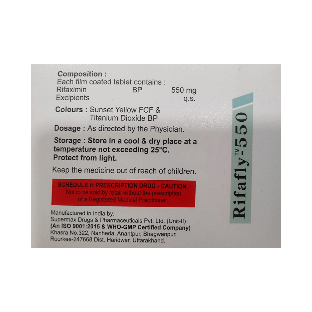 Rifafly 550 Tablet is an antibiotic that treats hepatic encephalopathy, a condition in which the liver fails to remove harmful toxins from the blood, leading to brain damage. It is also used to treat infectious diarrhea. It works by killing and stopping the growth of harmful bacteria in the intestines. This medicine can be used alone or in combination with other medicines. It may be taken with or without food, preferably at the same time, each day. It should be used in the dose and duration as advised by the doctor. Take it at the same time each day to get the most benefit and you should keep on taking this medicine for as long as you are prescribed. Stopping it early may make the infection to come back and harder to treat.Some people may develop side effects like vomiting, headache, dizziness, nausea, rashes, joint pain, and depression. These side effects are usually temporary and go away during treatment as your body adjusts to the medicine. Consult your doctor if these side effects bother you or will not go away. Your urine may become reddish in color due to this medicine. But, it is normal and harmless.Before starting treatment with this medicine, you should tell your doctor if you are pregnant, breastfeeding or suffering from any liver, kidney or heart problems or if you are allergic to any medicine.