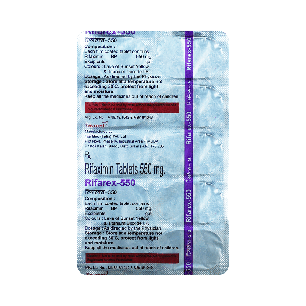 Rifarex 550mg Tablet is an antibiotic that treats hepatic encephalopathy, a condition in which the liver fails to remove harmful toxins from the blood, leading to brain damage. It is also used to treat infectious diarrhea. It works by killing and stopping the growth of harmful bacteria in the intestines. This medicine can be used alone or in combination with other medicines. It may be taken with or without food, preferably at the same time, each day. It should be used in the dose and duration as advised by the doctor. Take it at the same time each day to get the most benefit and you should keep on taking this medicine for as long as you are prescribed. Stopping it early may make the infection to come back and harder to treat.Some people may develop side effects like vomiting, headache, dizziness, nausea, rashes, joint pain, and depression. These side effects are usually temporary and go away during treatment as your body adjusts to the medicine. Consult your doctor if these side effects bother you or will not go away. Your urine may become reddish in color due to this medicine. But, it is normal and harmless.Before starting treatment with this medicine, you should tell your doctor if you are pregnant, breastfeeding or suffering from any liver, kidney or heart problems or if you are allergic to any medicine.