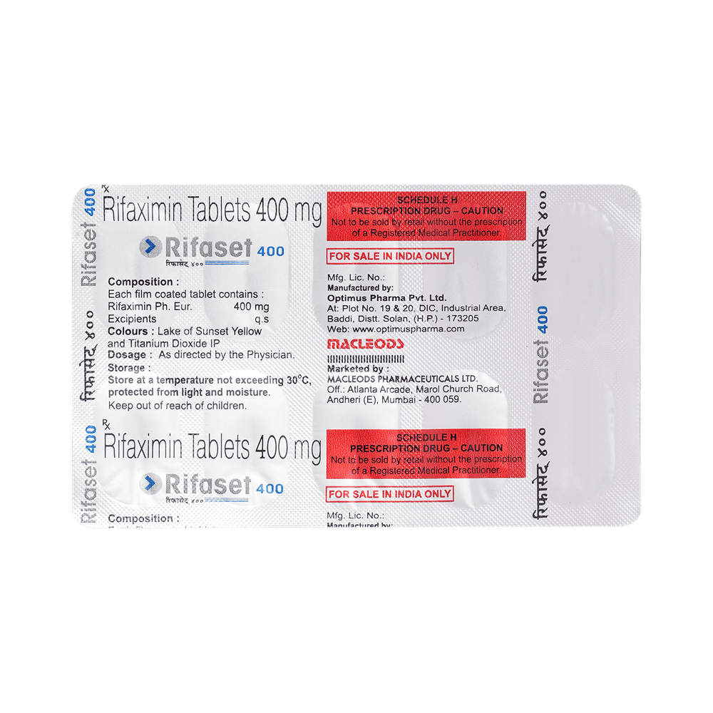 Rifaset 400 Tablet is an antibiotic that treats hepatic encephalopathy, a condition in which the liver fails to remove harmful toxins from the blood, leading to brain damage. It is also used to treat infectious diarrhea. It works by killing and stopping the growth of harmful bacteria in the intestines. This medicine can be used alone or in combination with other medicines. It may be taken with or without food, preferably at the same time, each day. It should be used in the dose and duration as advised by the doctor. Take it at the same time each day to get the most benefit and you should keep on taking this medicine for as long as you are prescribed. Stopping it early may make the infection to come back and harder to treat.Some people may develop side effects like vomiting, headache, dizziness, nausea, rashes, joint pain, and depression. These side effects are usually temporary and go away during treatment as your body adjusts to the medicine. Consult your doctor if these side effects bother you or will not go away. Your urine may become reddish in color due to this medicine. But, it is normal and harmless.Before starting treatment with this medicine, you should tell your doctor if you are pregnant, breastfeeding or suffering from any liver, kidney or heart problems or if you are allergic to any medicine.