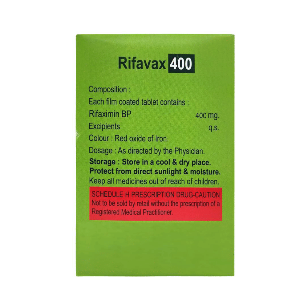 Rifavax 400mg Tablet is an antibiotic that treats hepatic encephalopathy, a condition in which the liver fails to remove harmful toxins from the blood, leading to brain damage. It is also used to treat infectious diarrhea. It works by killing and stopping the growth of harmful bacteria in the intestines. This medicine can be used alone or in combination with other medicines. It may be taken with or without food, preferably at the same time, each day. It should be used in the dose and duration as advised by the doctor. Take it at the same time each day to get the most benefit and you should keep on taking this medicine for as long as you are prescribed. Stopping it early may make the infection to come back and harder to treat.Some people may develop side effects like vomiting, headache, dizziness, nausea, rashes, joint pain, and depression. These side effects are usually temporary and go away during treatment as your body adjusts to the medicine. Consult your doctor if these side effects bother you or will not go away. Your urine may become reddish in color due to this medicine. But, it is normal and harmless.Before starting treatment with this medicine, you should tell your doctor if you are pregnant, breastfeeding or suffering from any liver, kidney or heart problems or if you are allergic to any medicine.