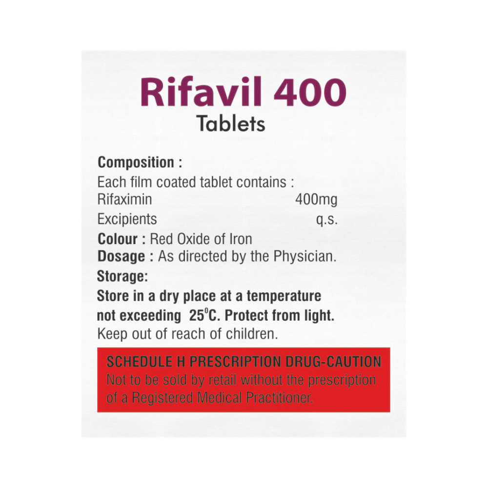 Rifavil Tablet 400mg is an antibiotic that treats hepatic encephalopathy, a condition in which the liver fails to remove harmful toxins from the blood, leading to brain damage. It is also used to treat infectious diarrhea. It works by killing and stopping the growth of harmful bacteria in the intestines. This medicine can be used alone or in combination with other medicines. It may be taken with or without food, preferably at the same time, each day. It should be used in the dose and duration as advised by the doctor. Take it at the same time each day to get the most benefit and you should keep on taking this medicine for as long as you are prescribed. Stopping it early may make the infection to come back and harder to treat.Some people may develop side effects like vomiting, headache, dizziness, nausea, rashes, joint pain, and depression. These side effects are usually temporary and go away during treatment as your body adjusts to the medicine. Consult your doctor if these side effects bother you or will not go away. Your urine may become reddish in color due to this medicine. But, it is normal and harmless.Before starting treatment with this medicine, you should tell your doctor if you are pregnant, breastfeeding or suffering from any liver, kidney or heart problems or if you are allergic to any medicine.