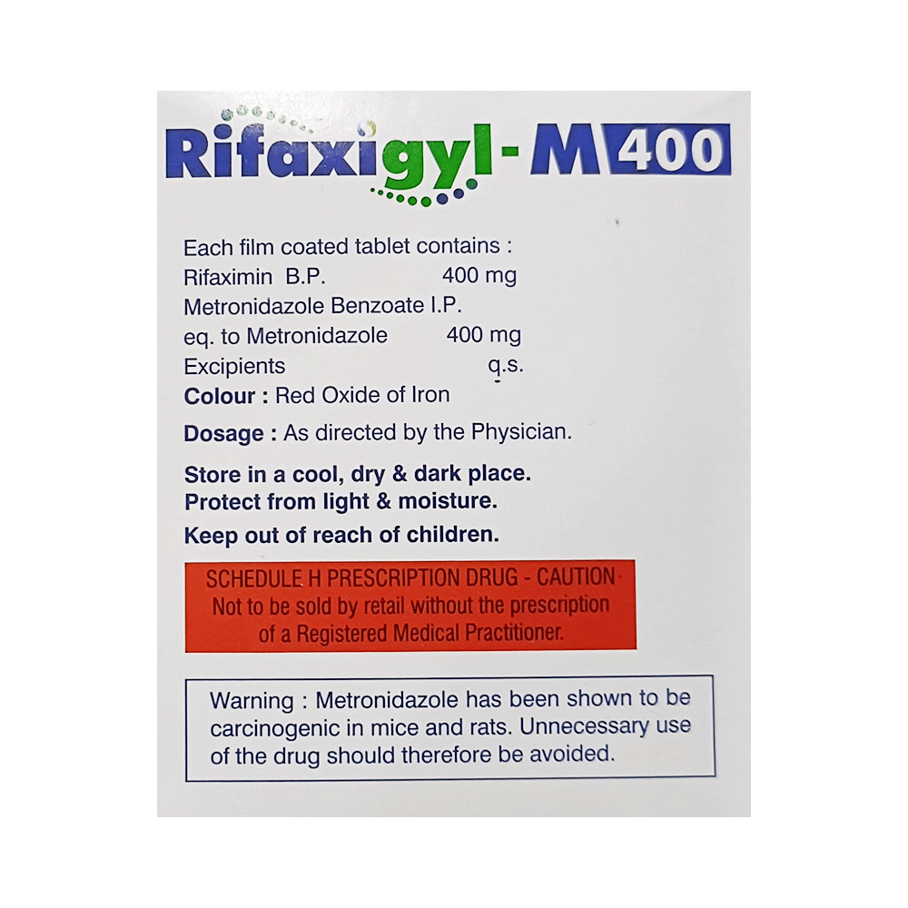 Rifaxigyl-M 400 Tablet is a combination of two antibiotics: Rifaximin and Metronidazole which treat infectious diarrhoea. These antibiotics work in the digestive tract by killing the bacteria and other microorganisms that cause diarrhoea. This treats your infection and relieves symptoms.