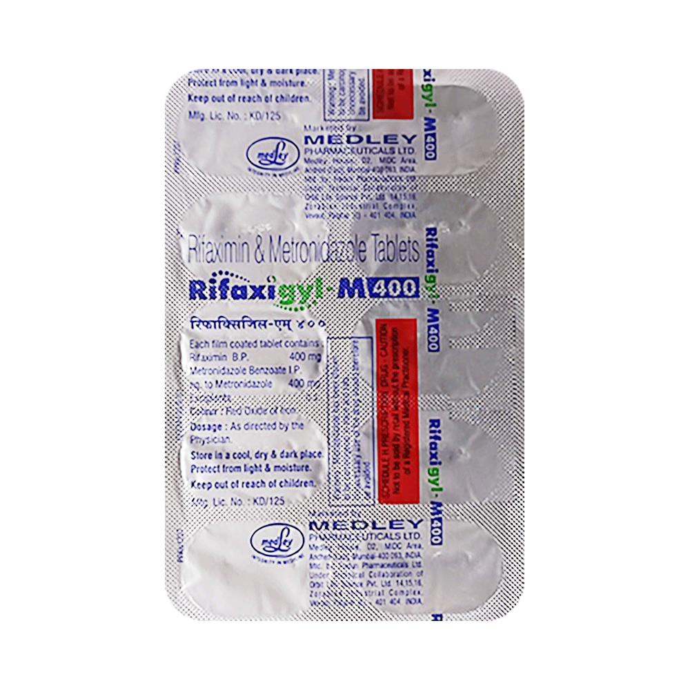 Rifaxigyl-M 400 Tablet is a combination medicine that is used to treat infectious diarrhea. It prevents the growth of microorganisms to treat the infection. Rifaxigyl-M 400 Tablet is a prescription medicine that is advised to be taken as suggested by the doctor. It should be taken with or without food and it must be taken at a fixed time to ensure better efficacy. Do not consume more than the recommended dose, as an overdose of it may have harmful effects on your body. If you miss a dose, take it as soon as you remember. The treatment must be completed even if you feel better to ensure a complete recovery.Rifaxigyl-M 400 Tablet may lead to some side effects such as nausea, vomiting, stomach pain, loss of appetite, headache, etc. To overcome any such side effects, it is advised to eat a healthy balanced diet and drink plenty of fluid. If any of the side effects get aggravated, contact your doctor immediately. If you experience any allergic reaction (rashes, itching, swelling, shortness of breath, etc.), you must consult your doctor immediately.Before taking this medicine, you should tell your doctor if you have any problems with your liver or kidneys. Also, tell your doctor if you are on any medication for any health condition. Pregnant or breastfeeding women should also consult with the doctors before taking it. Avoid drinking alcohol as it can cause excessive dizziness with this medicine. It usually does not impair your ability to drive, but you should not drive if it makes you feel sleepy or dizzy. If you are a known allergic to the medicine, you must refrain from using this medicine and consult your doctor. It is advised to take proper rest during the course of treatment for the medicine to work effectively.