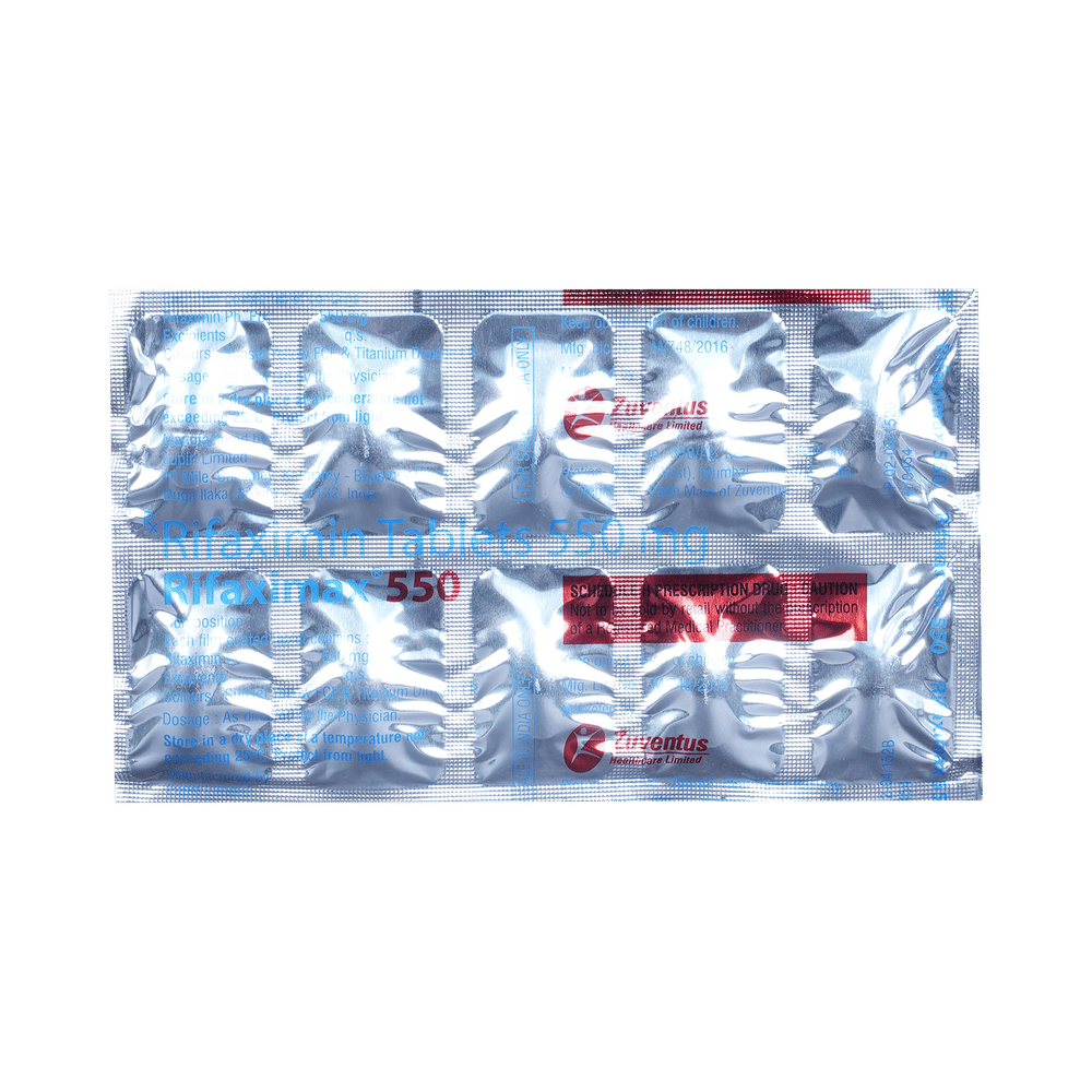 Rifaximax 550mg Tablet is an antibiotic that treats hepatic encephalopathy, a condition in which the liver fails to remove harmful toxins from the blood, leading to brain damage. It is also used to treat infectious diarrhea. It works by killing and stopping the growth of harmful bacteria in the intestines. This medicine can be used alone or in combination with other medicines. It may be taken with or without food, preferably at the same time, each day. It should be used in the dose and duration as advised by the doctor. Take it at the same time each day to get the most benefit and you should keep on taking this medicine for as long as you are prescribed. Stopping it early may make the infection to come back and harder to treat.Some people may develop side effects like vomiting, headache, dizziness, nausea, rashes, joint pain, and depression. These side effects are usually temporary and go away during treatment as your body adjusts to the medicine. Consult your doctor if these side effects bother you or will not go away. Your urine may become reddish in color due to this medicine. But, it is normal and harmless.Before starting treatment with this medicine, you should tell your doctor if you are pregnant, breastfeeding or suffering from any liver, kidney or heart problems or if you are allergic to any medicine.