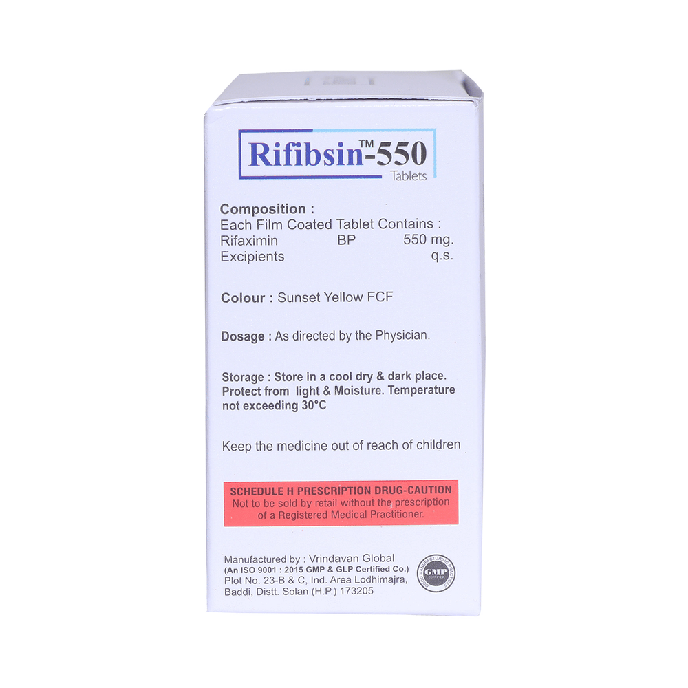 Rifibsin 550 Tablet is an antibiotic that treats hepatic encephalopathy, a condition in which the liver fails to remove harmful toxins from the blood, leading to brain damage. It is also used to treat infectious diarrhea. It works by killing and stopping the growth of harmful bacteria in the intestines. This medicine can be used alone or in combination with other medicines. It may be taken with or without food, preferably at the same time, each day. It should be used in the dose and duration as advised by the doctor. Take it at the same time each day to get the most benefit and you should keep on taking this medicine for as long as you are prescribed. Stopping it early may make the infection to come back and harder to treat.Some people may develop side effects like vomiting, headache, dizziness, nausea, rashes, joint pain, and depression. These side effects are usually temporary and go away during treatment as your body adjusts to the medicine. Consult your doctor if these side effects bother you or will not go away. Your urine may become reddish in color due to this medicine. But, it is normal and harmless.Before starting treatment with this medicine, you should tell your doctor if you are pregnant, breastfeeding or suffering from any liver, kidney or heart problems or if you are allergic to any medicine.