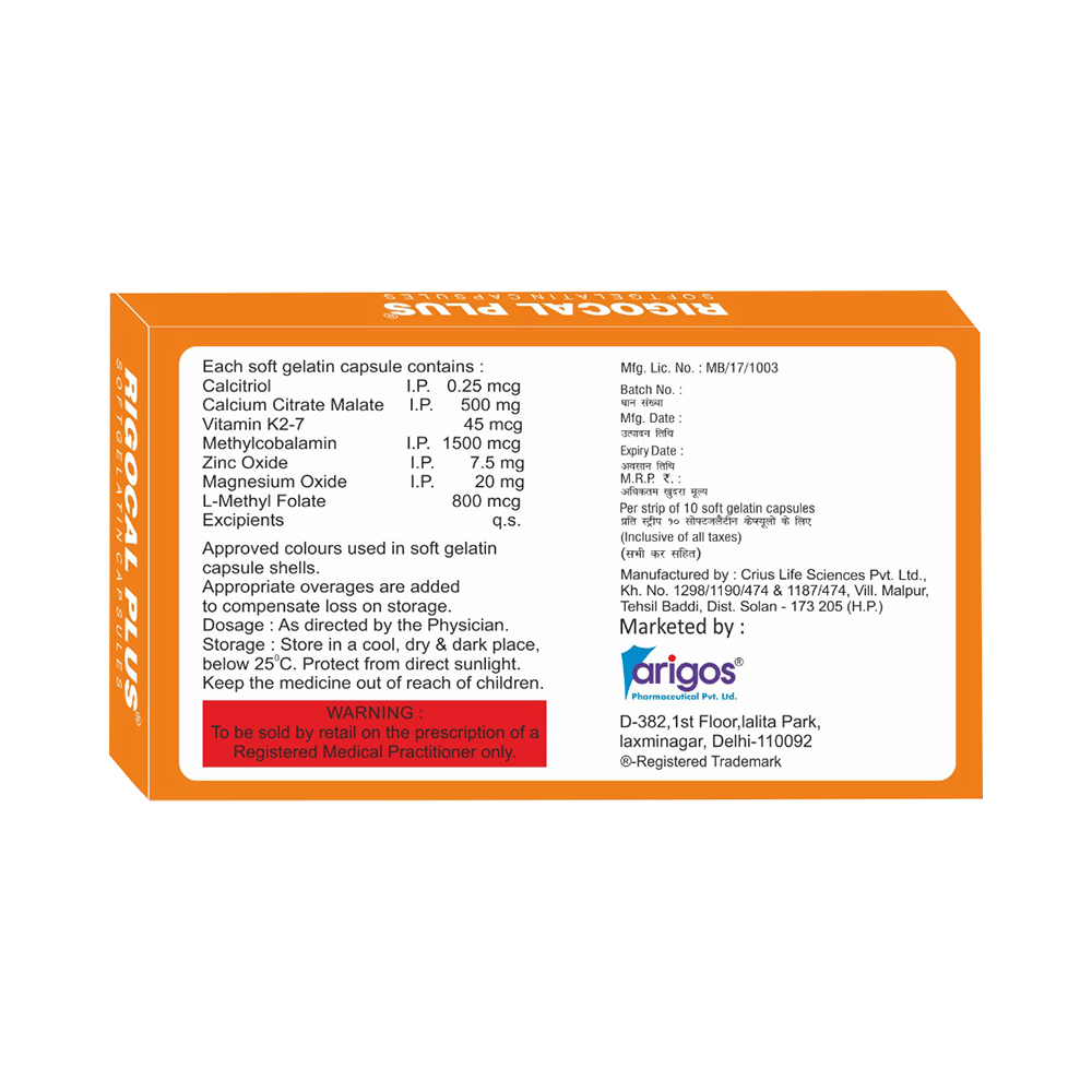 Rigocal Plus Soft Gelatin Capsule is a combination of seven medicines: calcitriol, calcium carbonate, zinc, magnesium, vitamin K2-7, methylcobalamin, and L-methyl folate. Calcitriol is the active form of vitamin D. It raises vitamin D levels in your blood. This, in turn, raises calcium levels in your blood by helping you absorb more calcium from your intestines. Calcium carbonate is a supplement that helps when your diet doesn't provide enough calcium. Zinc is a nutritional supplement that provides essential nutrients to our body and improves overall health. Magnesium is an antacid that neutralizes the excessive acid in the stomach. Vitamin K2-7 plays a central role in the metabolism of calcium, the main mineral found in your bones and teeth. Vitamin K2-7 activates the calcium-binding actions of two proteins: matrix GLA protein and osteocalcin, which help build and maintain bone health. Methylcobalamin is a form of vitamin B12 that restores its level in the body, thereby helping in treating certain anemias and nerve problems. L-methyl folate is the primary biologically active isomer of folic acid and the primary form of folate in circulation. Folic acid is a form of vitamin B. It is essential for the production of red blood cells, which transport oxygen throughout the body.