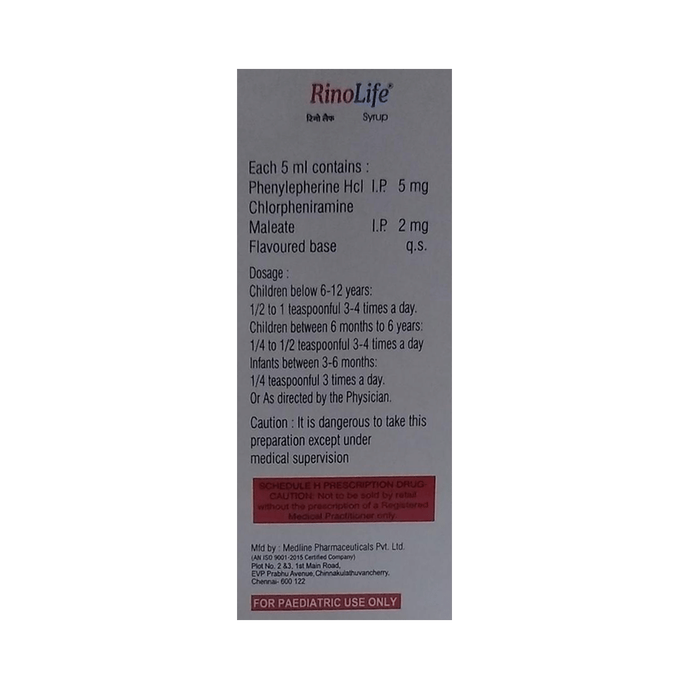 Rinolife Syrup is a combination medicine used for the symptomatic treatment of common cold in children. It helps relieve discomfort caused by a runny nose, blocked nose, and sneezing, allowing the child to breathe more easily and feel better. Rinolife Syrup may be given to your child with or without food. Always follow the exact dose and duration prescribed by the doctor. The dosage will depend on your child’s age, weight, and the severity of symptoms. Do not stop the medicine early, even if your child seems to be feeling better, unless advised by the doctor.Common side effects may include nausea, vomiting, or headache. These are usually mild and temporary. However, if you notice anything unusual or are concerned about how your child is responding to the medicine, consult your doctor promptly. This medicine may also cause drowsiness, so avoid engaging your child in activities that require alertness until you know how it affects them.Make sure your child stays well hydrated while taking Rinolife Syrup. Inform your doctor if your child has any history of liver or kidney problems, as the dose may need to be adjusted accordingly.Note: As per the Ministry of Health and Family Welfare, Rinolife Syrup should not be used in children below 4 years of age.