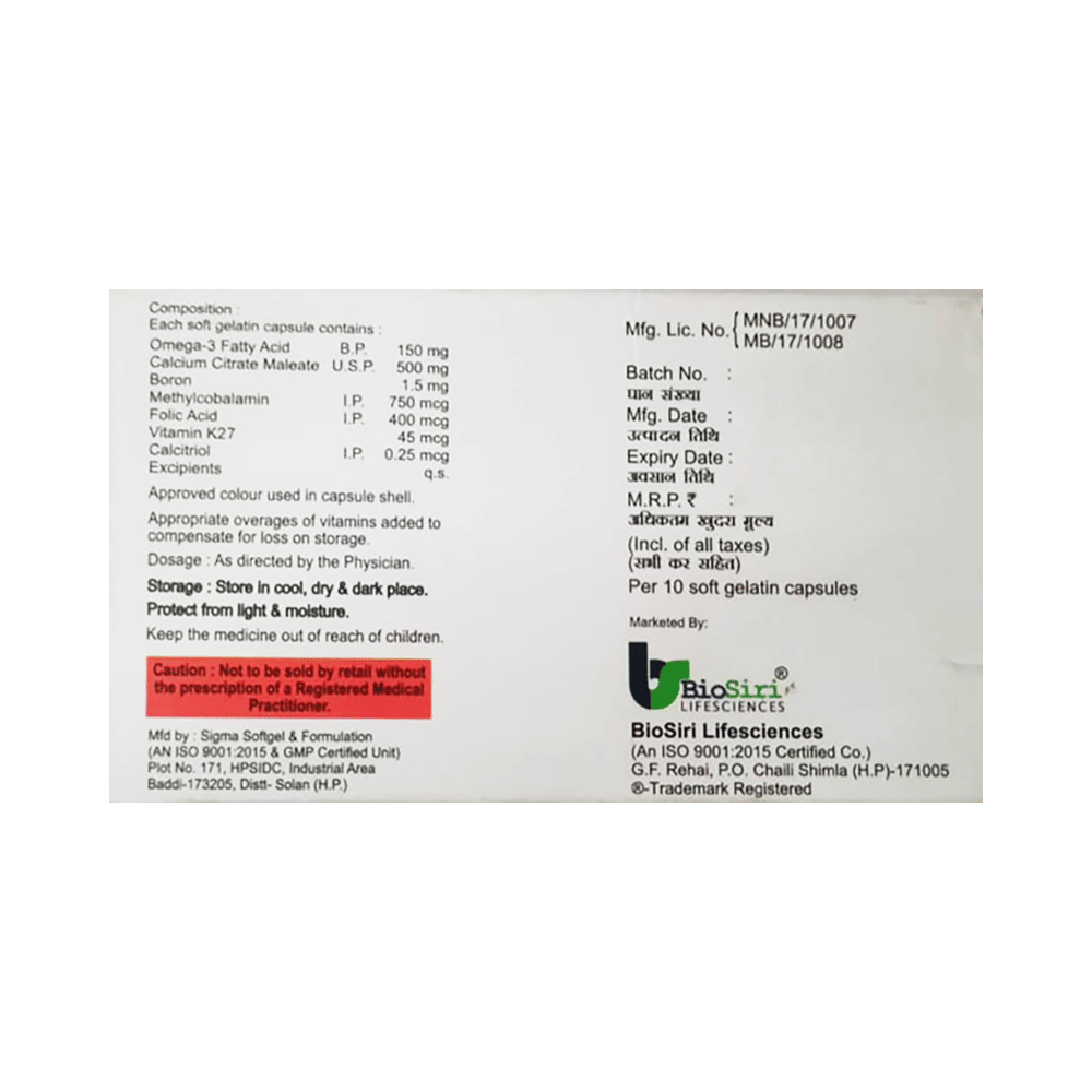 Salt Composition: Omega-3 fatty acid (150mg) + Calcium Citrate Malate (500mg) + Boron (1.5mg) + Methylcobalamin (750mcg) + Folic Acid (400mcg) + Vitamin K2-7 (45mcg) + Calcitriol (0.25mcg)