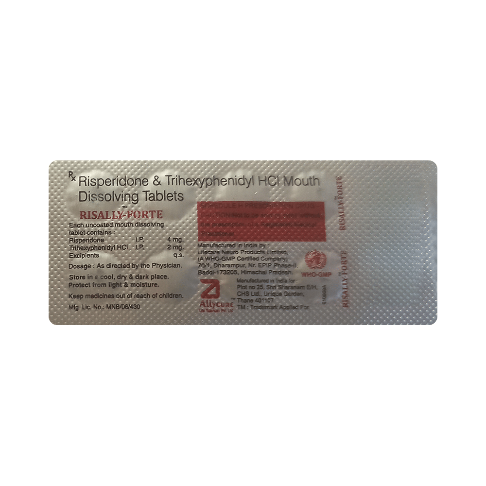 Risally Forte Tablet MD is a combination of two medicines: Risperidone and Trihexyphenidyl. Risperidone is an atypical antipsychotic that works by balancing the levels of chemical messengers (dopamine and serotonin) to improve mood, thoughts, and behavior. Trihexyphenidyl is an anticholinergic that works on the nervous system and corrects some of the chemical imbalances that cause Parkinson's disease and certain side effects occurring during antipsychotic treatment.