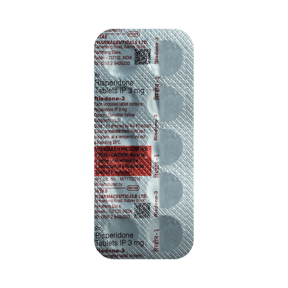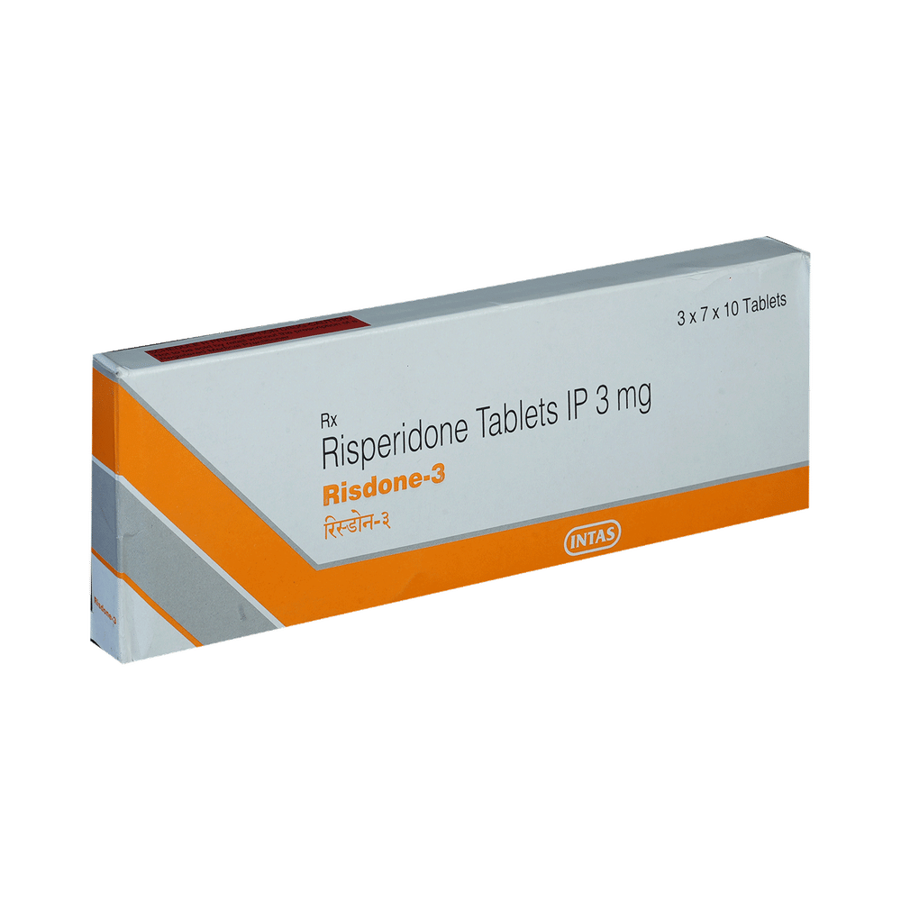 RISDone 3 Tablet is used in the treatment of schizophrenia (a mental disorder that can result in hallucinations or delusions and also adversely affects a person’s ability to think and behave) and mania. RISDone 3 Tablet is taken with or without food, preferably at night. However, it is advised to take it at the same time each day as this helps to maintain a consistent level of medicine in the body. Take this in the dose and duration as advised by your doctor and if you have missed a dose, take it as soon as you remember. It is important that this medication is not stopped suddenly without talking to your doctor as it may worsen your symptoms. However, discontinue this medicine immediately if you experience Neuroleptic malignant syndrome (NMS), characterized by fever, muscle rigidity, and altered consciousness or seizures.Some common side effects of this medicine include insomnia, sedation, somnolence, vomiting, coughing, parkinsonism, headache, and fever. Initially, this medicine may cause a sudden drop in blood pressure when you change positions, so it is better to rise slowly if you have been sitting or lying down. It also causes dizziness and sleepiness, so do not drive or do anything that requires mental focus until you know how this medicine affects you. This medicine may increase your weight but, modifying your lifestyle by having a healthy diet and exercising regularly can reduce this side effect.You should be cautious while using this medicine as it may increase the risk of developing diabetes, so it is better to monitor glucose regularly. Inform your doctor if you develop any unusual changes in mood or behavior, new or worsening depression, or suicidal thoughts while taking this medicine.