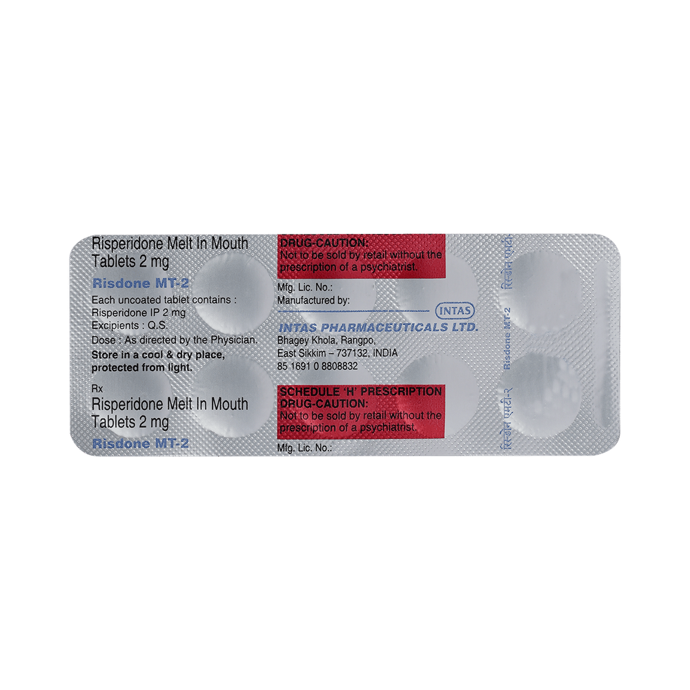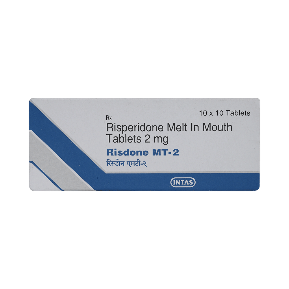 Risdone MT 2mg Tablet is used in the treatment of schizophrenia (a mental disorder that can result in hallucinations or delusions and also adversely affects a person’s ability to think and behave) and mania. Risdone MT 2mg Tablet is taken with or without food, preferably at night. However, it is advised to take it at the same time each day as this helps to maintain a consistent level of medicine in the body. Take this in the dose and duration as advised by your doctor and if you have missed a dose, take it as soon as you remember. It is important that this medication is not stopped suddenly without talking to your doctor as it may worsen your symptoms. However, discontinue this medicine immediately if you experience Neuroleptic malignant syndrome (NMS), characterized by fever, muscle rigidity, and altered consciousness or seizures.Some common side effects of this medicine include insomnia, sedation, somnolence, vomiting, coughing, parkinsonism, headache, and fever. Initially, this medicine may cause a sudden drop in blood pressure when you change positions, so it is better to rise slowly if you have been sitting or lying down. It also causes dizziness and sleepiness, so do not drive or do anything that requires mental focus until you know how this medicine affects you. This medicine may increase your weight but, modifying your lifestyle by having a healthy diet and exercising regularly can reduce this side effect.You should be cautious while using this medicine as it may increase the risk of developing diabetes, so it is better to monitor glucose regularly. Inform your doctor if you develop any unusual changes in mood or behavior, new or worsening depression, or suicidal thoughts while taking this medicine.