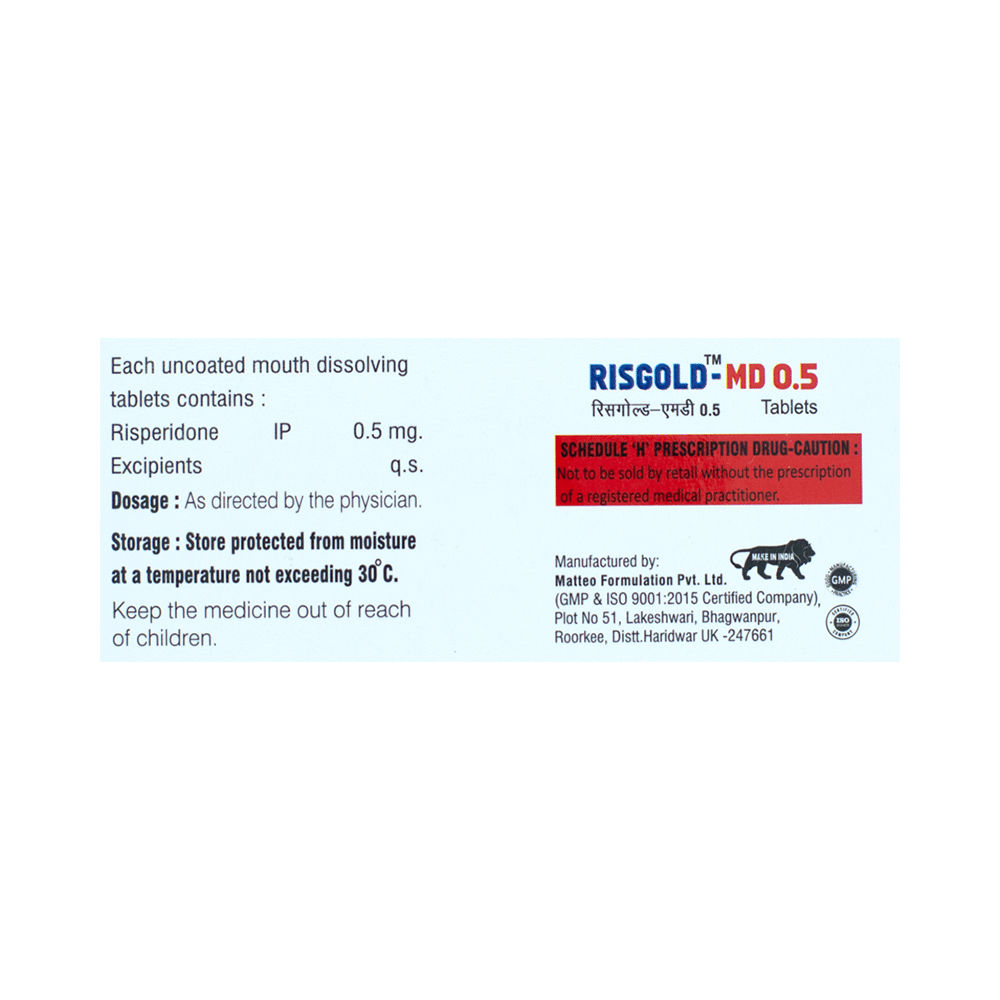 Risgold-MD 0.5 Tablet is an atypical antipsychotic. It works by affecting the levels of chemical messengers (dopamine and serotonin) to improve mood, thoughts and behavior.