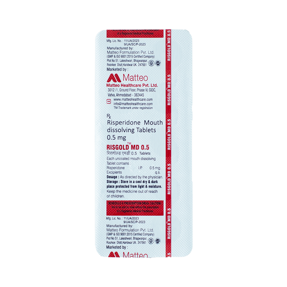 Risgold-MD 0.5 Tablet is used in the treatment of schizophrenia (a mental disorder that can result in hallucinations or delusions and also adversely affects a person’s ability to think and behave) and mania. Risgold-MD 0.5 Tablet is taken with or without food, preferably at night. However, it is advised to take it at the same time each day as this helps to maintain a consistent level of medicine in the body. Take this in the dose and duration as advised by your doctor and if you have missed a dose, take it as soon as you remember. It is important that this medication is not stopped suddenly without talking to your doctor as it may worsen your symptoms. However, discontinue this medicine immediately if you experience Neuroleptic malignant syndrome (NMS), characterized by fever, muscle rigidity, and altered consciousness or seizures.Some common side effects of this medicine include insomnia, sedation, somnolence, vomiting, coughing, parkinsonism, headache, and fever. Initially, this medicine may cause a sudden drop in blood pressure when you change positions, so it is better to rise slowly if you have been sitting or lying down. It also causes dizziness and sleepiness, so do not drive or do anything that requires mental focus until you know how this medicine affects you. This medicine may increase your weight but, modifying your lifestyle by having a healthy diet and exercising regularly can reduce this side effect.You should be cautious while using this medicine as it may increase the risk of developing diabetes, so it is better to monitor glucose regularly. Inform your doctor if you develop any unusual changes in mood or behavior, new or worsening depression, or suicidal thoughts while taking this medicine.