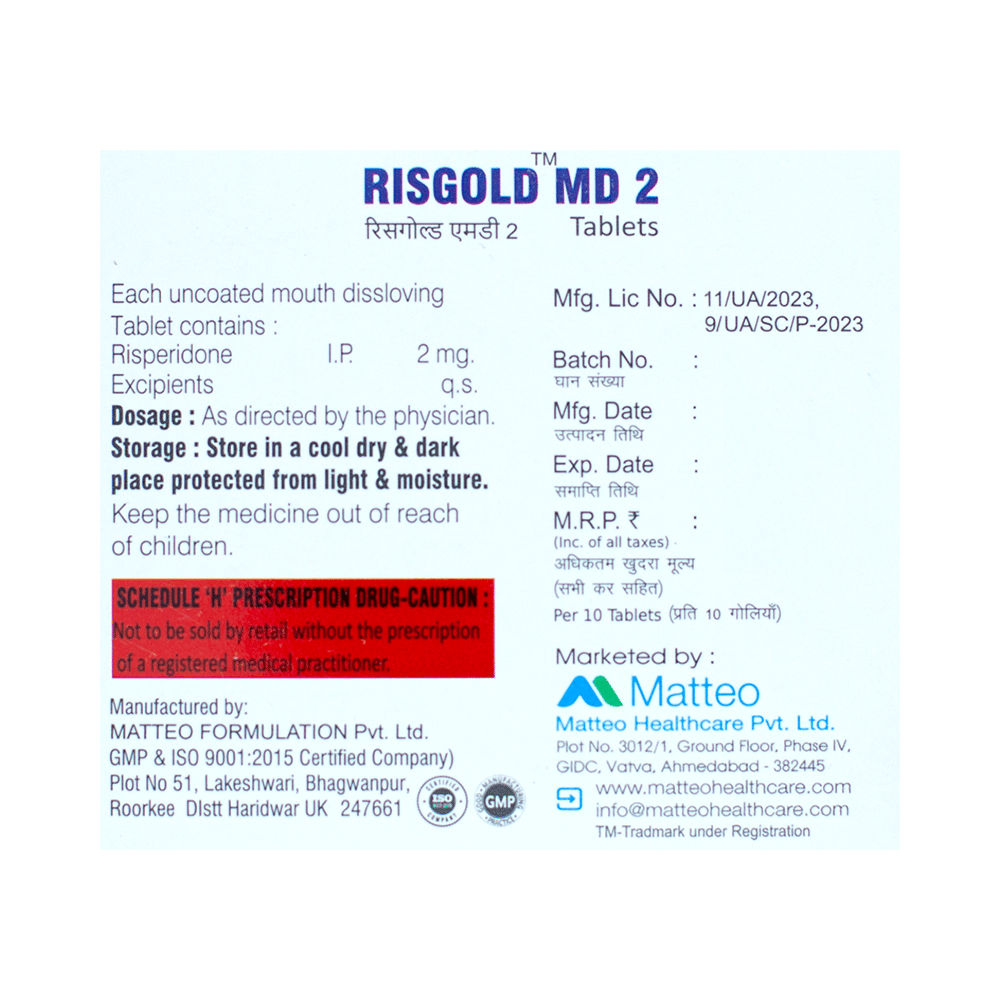 Risgold MD 2 Tablet is an atypical antipsychotic. It works by affecting the levels of chemical messengers (dopamine and serotonin) to improve mood, thoughts and behavior.