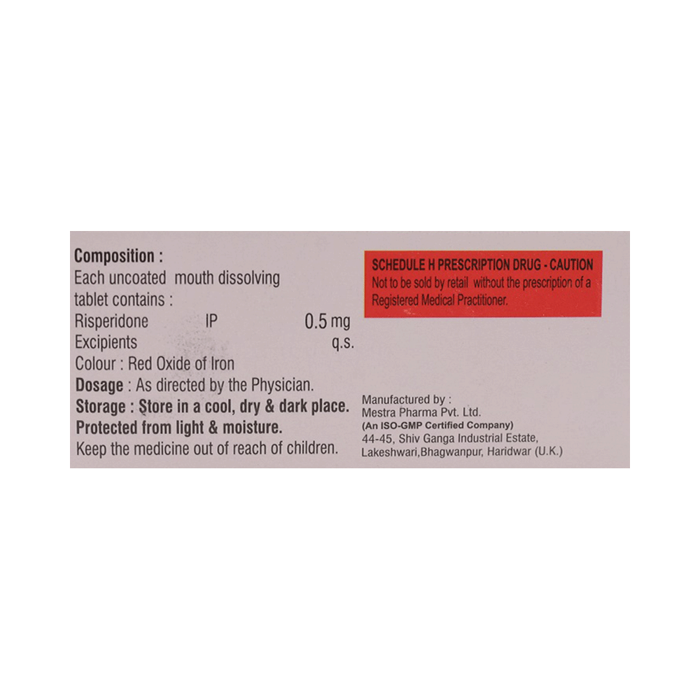 Risvia-MD 0.5 Tablet is used in the treatment of schizophrenia (a mental disorder that can result in hallucinations or delusions and also adversely affects a person’s ability to think and behave) and mania. Risvia-MD 0.5 Tablet is taken with or without food, preferably at night. However, it is advised to take it at the same time each day as this helps to maintain a consistent level of medicine in the body. Take this in the dose and duration as advised by your doctor and if you have missed a dose, take it as soon as you remember. It is important that this medication is not stopped suddenly without talking to your doctor as it may worsen your symptoms. However, discontinue this medicine immediately if you experience Neuroleptic malignant syndrome (NMS), characterized by fever, muscle rigidity, and altered consciousness or seizures.Some common side effects of this medicine include insomnia, sedation, somnolence, vomiting, coughing, parkinsonism, headache, and fever. Initially, this medicine may cause a sudden drop in blood pressure when you change positions, so it is better to rise slowly if you have been sitting or lying down. It also causes dizziness and sleepiness, so do not drive or do anything that requires mental focus until you know how this medicine affects you. This medicine may increase your weight but, modifying your lifestyle by having a healthy diet and exercising regularly can reduce this side effect.You should be cautious while using this medicine as it may increase the risk of developing diabetes, so it is better to monitor glucose regularly. Inform your doctor if you develop any unusual changes in mood or behavior, new or worsening depression, or suicidal thoughts while taking this medicine.