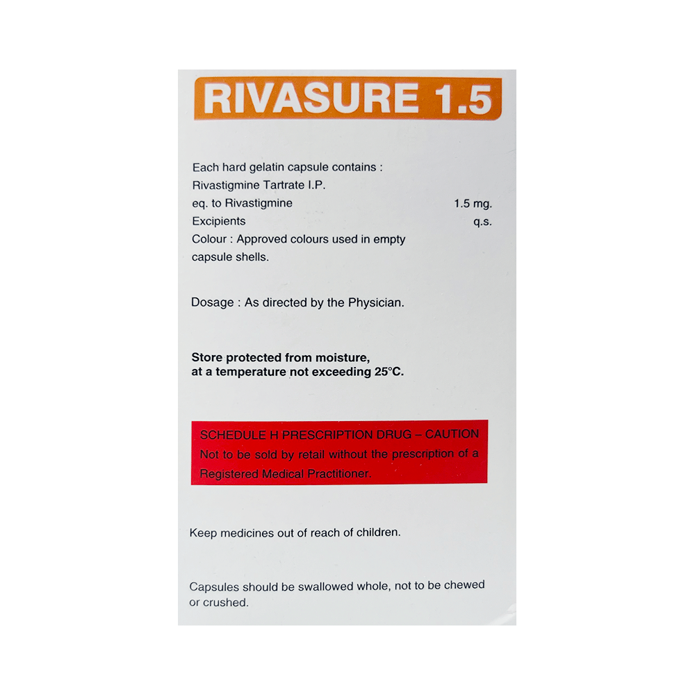 Rivasure Capsule is used to treat mild to moderate dementia in Alzheimer’s disease, a progressive illness that gradually affects memory and thinking. It is also used for dementia-associated Parkinson’s disease. It does not cure these illnesses but may help improve memory, awareness, and other symptoms. Your doctor will explain how to take Rivasure Capsule. Follow the instructions carefully to get the most benefit. The dose may change from time to time to suit your individual needs. You may take it with food, preferably at night before going to bed. It can take up to a few weeks for symptoms to improve so keep taking your medicine regularly. You should not stop taking this medicine without consulting your doctor.Some common side effects of this medicine include nausea, vomiting, weight loss, indigestion, and weakness. You may have side effects more often when you start your treatment or when your dose is increased. Usually, the side effects will slowly go away as your body gets used to the Rivasure Capsule. If they are severe or will not go away, you should contact your doctor.Before using Rivasure Capsule, you should tell your doctor if you’ve ever had heart problems, stomach ulcers, epilepsy, or asthma. It may also affect, or be affected by, some other drugs you are using so let your doctor know what these are to be safe. During pregnancy, this medicine should only be taken if it is advised.