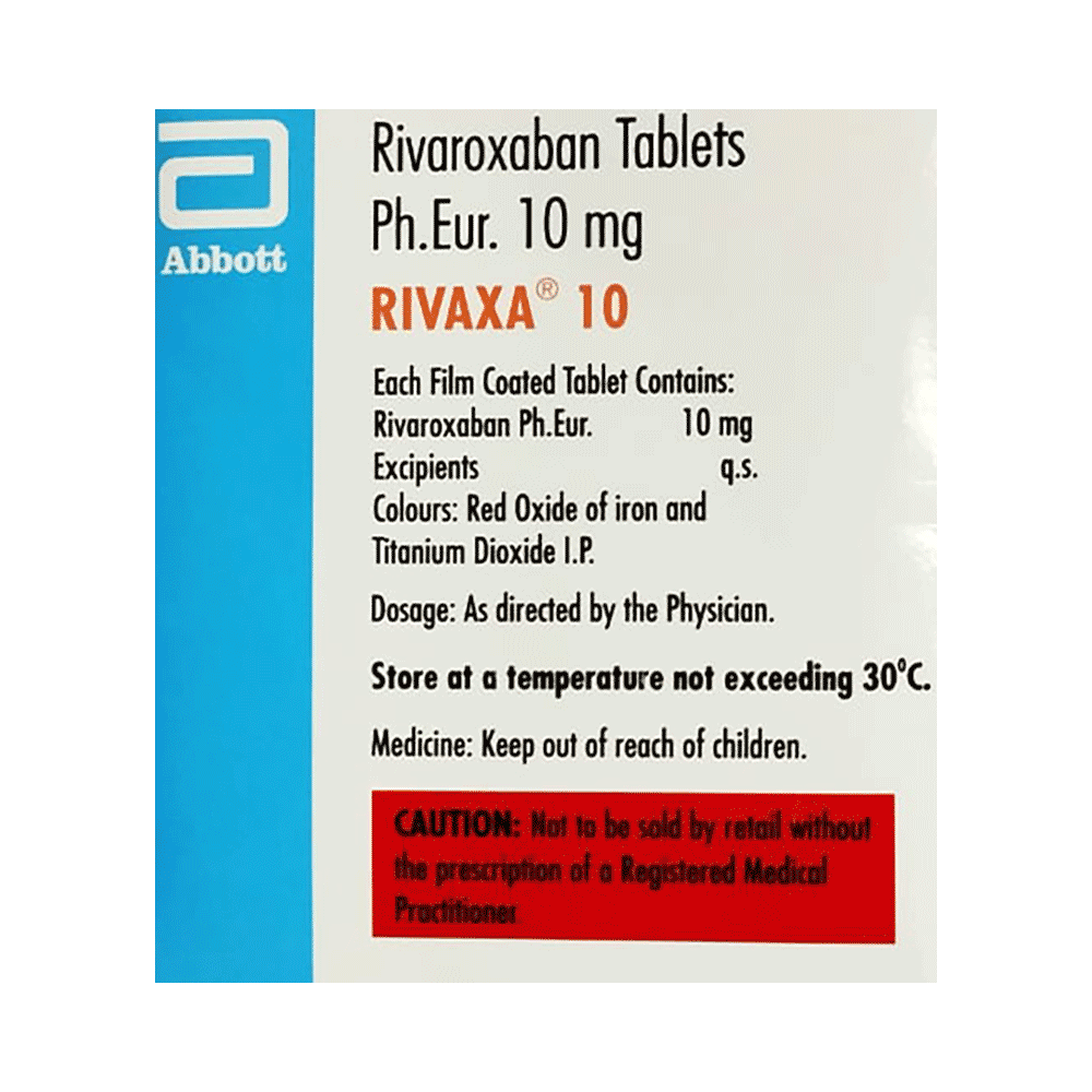 RIVAXa 10mg Tablet is a medicine known as an anticoagulant or blood thinner. It helps prevent and treat blood clots. It is used to reduce the risk of stroke and heart attack. It prevents and treats clot formation in the veins of your legs, lungs, brain and heart. RIVAXa 10mg Tablet is commonly used in patients with irregular heart rhythm (atrial fibrillation) to prevent clot formation. It also reduces the risk of getting clots in people who have undergone knee or hip replacement surgeries. It may be taken with or without food. Take it at the same time each day for maximum benefits. You may need to take this medicine for many years, even for life in some cases. Do not stop taking it or change the dose without guidance from your doctor. It could quickly put you more at risk of having a heart attack, stroke, or thrombosis (formation of a blood clot within a blood vessel). You can reduce your risk of having a blood clot by making changes to your lifestyle, such as not smoking, eating a healthy diet, getting regular exercise, and losing weight if you need to.The most common side effect of RIVAXa 10mg Tablet is bleeding more easily than normal, for example, having nosebleeds or bruising. If you experience any symptoms, tell your doctor immediately. Do not take this medicine if you have severe kidney or liver problems, if you are currently bleeding or if you are taking other medicines to reduce blood clotting. You should not breastfeed while using this medicine. Unlike other anticoagulants, a regular blood test (PT-INR) is not required while taking this medicine.