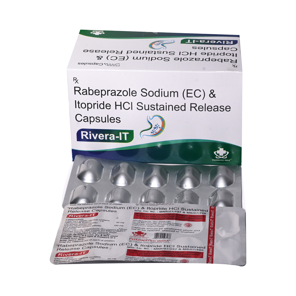 Rivera-IT Capsule SR is a combination of two medicines: Rabeprazole and Itopride. Rabeprazole is a proton pump inhibitor (PPI). It works by reducing the amount of acid in the stomach which helps in the relief of acid-related indigestion and heartburn. Itopride is a prokinetic which works on the region in the brain that controls vomiting. It also acts on the upper digestive tract to increase the movement of the stomach and intestines, allowing food to move more easily through the stomach.