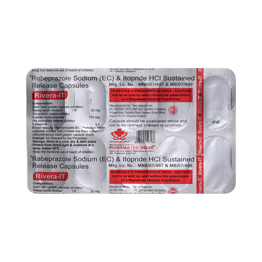 Rivera-IT Capsule SR is a combination medicine used to treat gastroesophageal reflux disease (Acid reflux) and peptic ulcer disease by relieving the symptoms of acidity such as heartburn, stomach pain, or irritation. It also neutralizes the acid and promotes easy passage of gas to reduce stomach discomfort. Rivera-IT Capsule SR is taken with or without food in a dose and duration as advised by the doctor. The dose you are given will depend on your condition and how you respond to the medicine. You should keep taking this medicine for as long as your doctor recommends. If you stop treatment too early your symptoms may come back and your condition may worsen. Let your healthcare team know about all other medications you are taking as some may affect, or be affected by this medicine.The most common side effects are stomach pain, diarrhea, constipation, headache, flatulence, weakness, and increased saliva production. Most of these are temporary and usually resolve with time. Contact your doctor straight away if you are at all concerned about any of these side effects. This medicine may cause dizziness and sleepiness, so do not drive or do anything that requires mental focus until you know how this medicine affects you. Avoid drinking alcohol while taking this medicine as it can worsen your sleepiness. Lifestyle modifications like having cold milk and avoiding hot tea, coffee, spicy food or chocolate can help you to get better results.Before you start taking this medicine it is important to inform your doctor if you are suffering from liver disease. You should also tell your doctor if you are pregnant, planning pregnancy or breastfeeding.