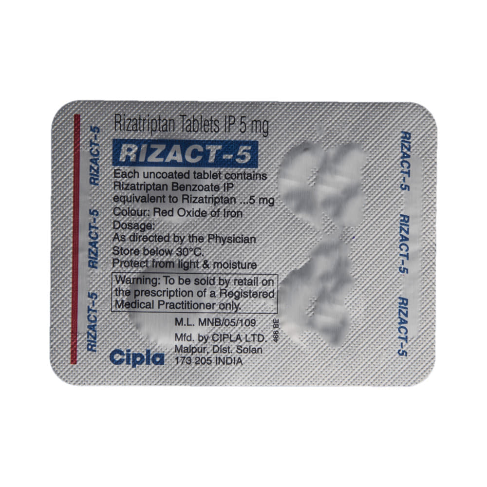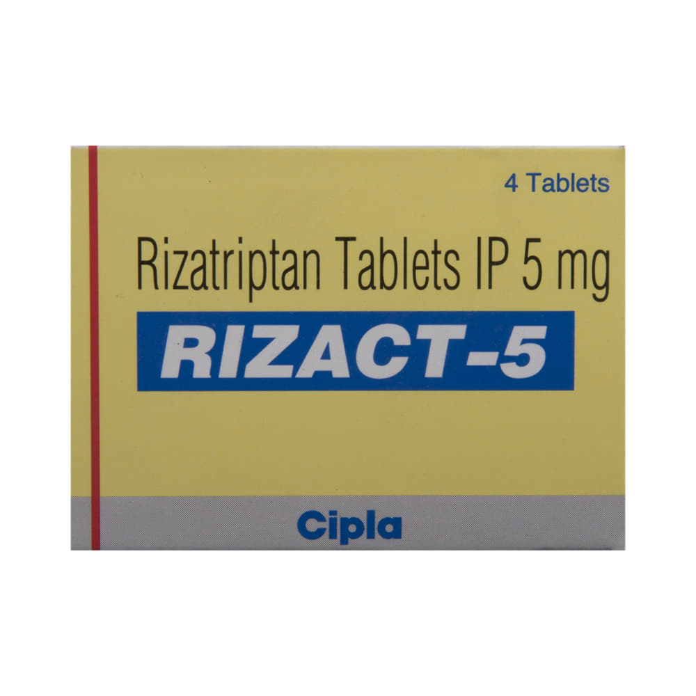 RIZact 5 Tablet is used in the treatment of acute attacks of migraine. It relieves the symptoms of migraine and prevents the attack from becoming worse. This medicine helps by narrowing the blood vessels, thereby relieving migraine headaches. RIZact 5 Tablet may be taken with or without food. However, it is advised to take it at the same time each day as this helps to maintain a consistent level of medicine in the body. Do not skip any doses and finish the full course of treatment even if you feel better and if you have missed a dose, take it as soon as you remember. You should continue to take this medicine for as long as the doctor advises and do not stop taking it suddenly.Side effects associated with the use of this medicine include dry mouth, sensation of heaviness, nausea, weakness, and paresthesia (tingling or pricking sensation). However, these are usually temporary and usually resolve on their own. Please consult your doctor if these do not subside or worry you.It may also cause sleepiness at the beginning of your treatment, so do not drive, operate machinery, until you know how this medicine affects you. This medicine may cause changes in your mood and you may feel depressed, therefore, regular monitoring of behavior is important. Pregnant or breastfeeding mothers should consult their doctor before taking this medicine.Inform your doctor if you are suffering from any heart problems, as the use of RIZact 5 Tablet is contraindicated in some heart diseases. Regular monitoring of blood pressure is required while taking this medicine. Consult your doctor and stop this medicine if you develop severe chest or stomach pain, bloody diarrhea, or significantly high blood pressure, after taking this medicine.