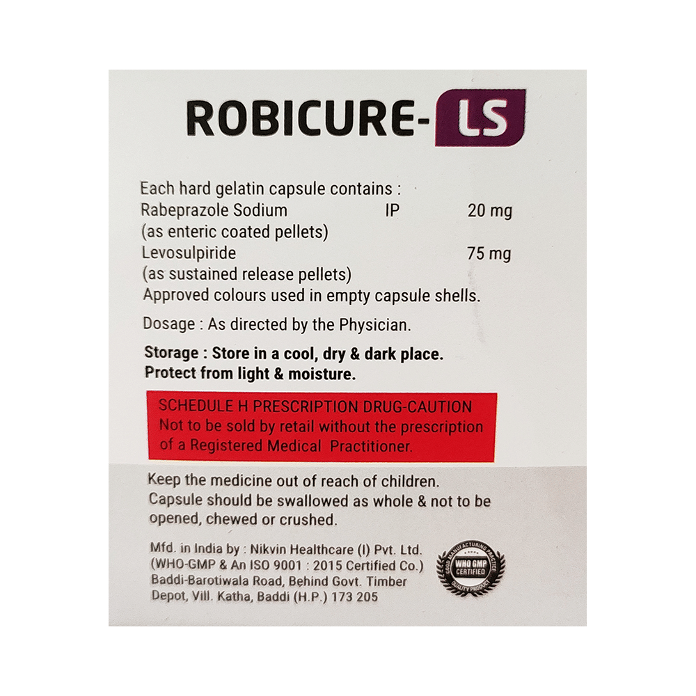 In Treatment of Intestinal ulcersIntestinal ulcers are painful sores that develop in the inner lining of the stomach or gut (intestine). Robicure-LS Capsule SR reduces the amount of acid your stomach makes which prevents further damage to the ulcer as it heals naturally. You may be given other medicines along with this medicine depending on what caused the ulcer. You need to keep taking Robicure-LS Capsule SR as prescribed by the doctor for it to be effective, even if the symptoms seem to disappear.In Treatment of Irritable bowel syndromeIrritable bowel syndrome is a chronic (long-term) inflammatory disease of the large intestine (colon) that usually needs long term management. This can lead to bleeding, frequent diarrhea, bloating, flatulence, cramps and stomach pain. Robicure-LS Capsule SR relaxes the muscles in your stomach and gut (intestine) and relieves these symptoms effectively. Usually, it is used along with other medicines for management of your condition. Continue taking it for as long as the doctor may advise you to. You need to take this medicine regularly to get the most out of it. Take a fiber-rich diet, avoid oily or spicy food and drink plenty of fluids while taking it to make sure you stay hydrated.In Treatment of Gastroesophageal reflux disease (Acid reflux)Gastroesophageal reflux disease (GERD) is a chronic (long-term) condition in which there is an excess production of acid in the stomach. Robicure-LS Capsule SR reduces the amount of acid your stomach makes and relieves the pain associated with heartburn and acid reflux. You should take it exactly as it is prescribed for it to be effective.Some simple lifestyle changes can help reduce the symptoms of GERD. Think about what foods trigger heartburn and try to avoid them; eat smaller, more frequent meals; try to lose weight if you are overweight and try to find ways to relax. Do not eat within 3-4 hours of going to bed.show moreshow less