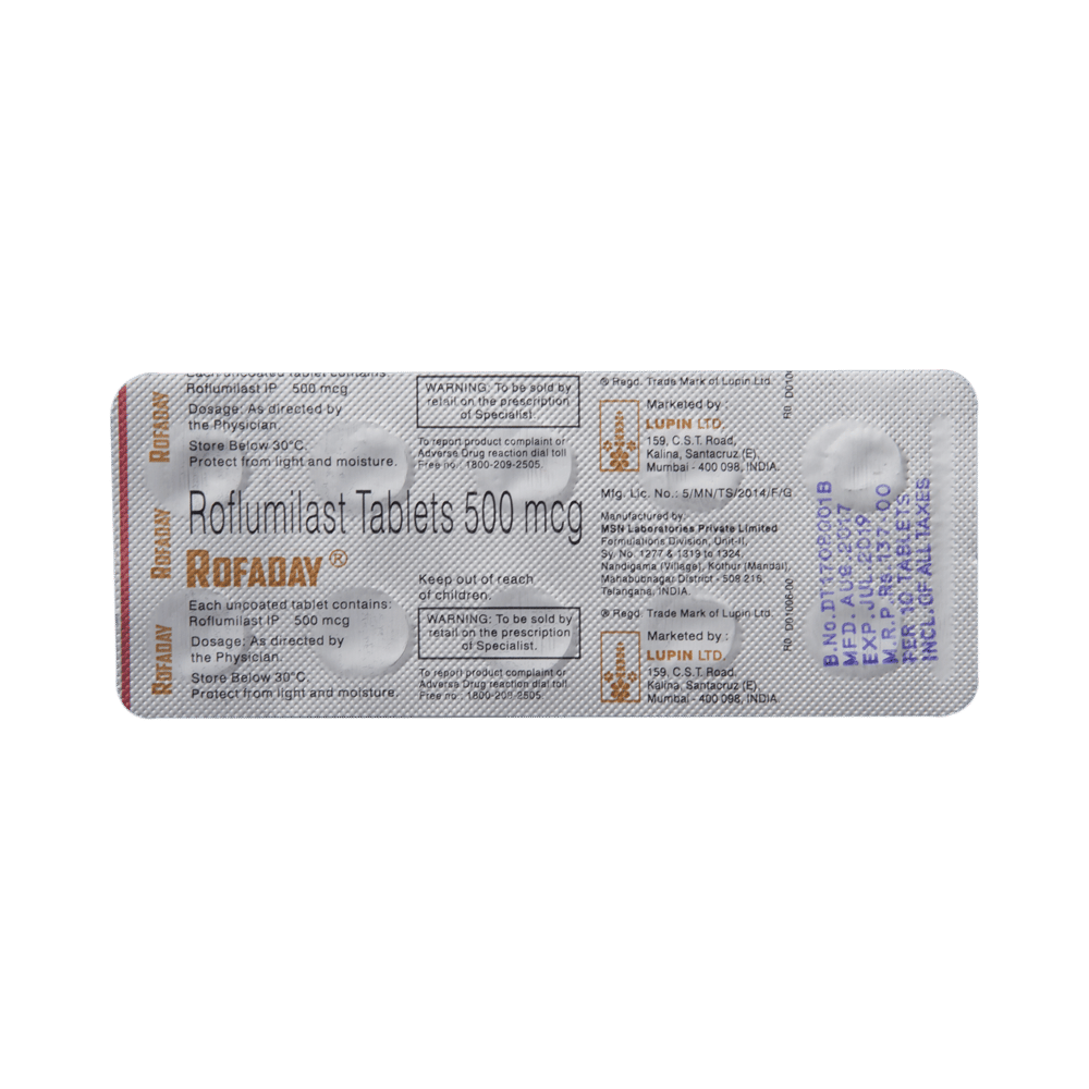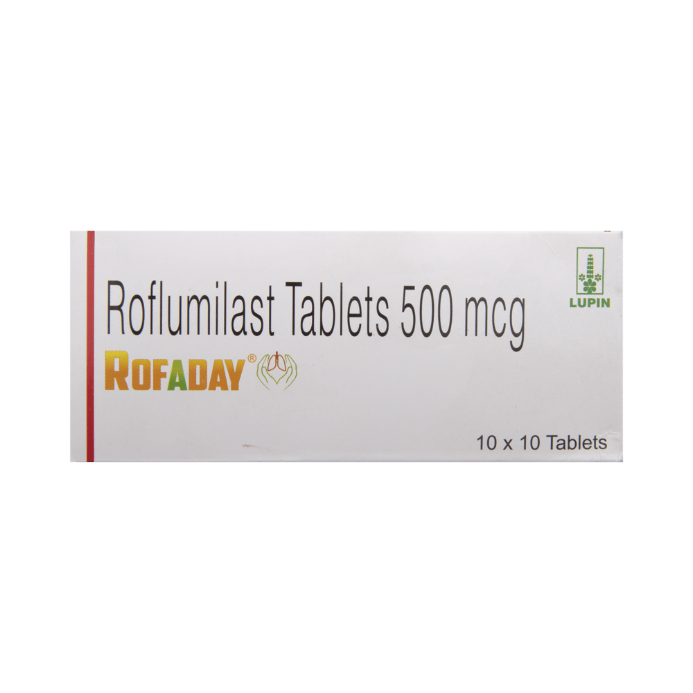 Rofaday Tablet is used to prevent chronic obstructive pulmonary disease(COPD), group of lung disorders in which the flow of air to the lungs is blocked and chronic bronchitis. It works by opening the airways and makes breathing easier. Rofaday Tablet can be taken with or without food, but take it at the same time every day to get the most benefit. The dose and how often you take it depends on what you are taking it for. Your doctor will decide how much you need to improve your symptoms. You should take this medicine for as long as it is prescribed for you. Do not miss even a single dose, if in any case, you missed a dose, take it as soon as you remember or better to skip the missed dose and continue with regular dosing. It does not prevent the already started breathing trouble or COPD, hence always carry your medical inhaler with you for an emergency.The most common side effects of this medicine include headache, weight loss, dizziness, insomnia, and back pain. If these bother you, or appear serious, let your doctor know. There may be ways of reducing or preventing them. To overcome dizziness, you must avoid driving and attention-seeking activity until you do not know how medicine affects you. If you experienced sudden weight loss, then regular weight monitoring is required.Before taking this medicine, let your doctor if you suffer from depression, or suicidal thoughts, or if you have HIV, multiple sclerosis. Your doctor should also know about all other medicines you are taking as many of these may make this medicine less effective or change the way it works. You must inform your doctor if you are pregnant or breastfeeding before treatment.