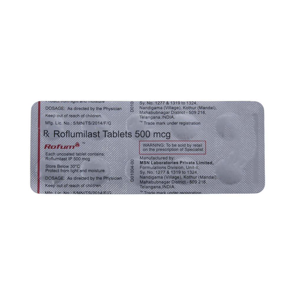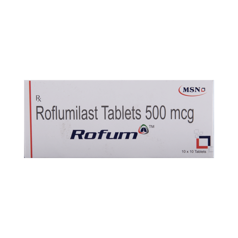 Rofum Tablet is used to prevent chronic obstructive pulmonary disease(COPD), group of lung disorders in which the flow of air to the lungs is blocked and chronic bronchitis. It works by opening the airways and makes breathing easier. Rofum Tablet can be taken with or without food, but take it at the same time every day to get the most benefit. The dose and how often you take it depends on what you are taking it for. Your doctor will decide how much you need to improve your symptoms. You should take this medicine for as long as it is prescribed for you. Do not miss even a single dose, if in any case, you missed a dose, take it as soon as you remember or better to skip the missed dose and continue with regular dosing. It does not prevent the already started breathing trouble or COPD, hence always carry your medical inhaler with you for an emergency.The most common side effects of this medicine include headache, weight loss, dizziness, insomnia, and back pain. If these bother you, or appear serious, let your doctor know. There may be ways of reducing or preventing them. To overcome dizziness, you must avoid driving and attention-seeking activity until you do not know how medicine affects you. If you experienced sudden weight loss, then regular weight monitoring is required.Before taking this medicine, let your doctor if you suffer from depression, or suicidal thoughts, or if you have HIV, multiple sclerosis. Your doctor should also know about all other medicines you are taking as many of these may make this medicine less effective or change the way it works. You must inform your doctor if you are pregnant or breastfeeding before treatment.