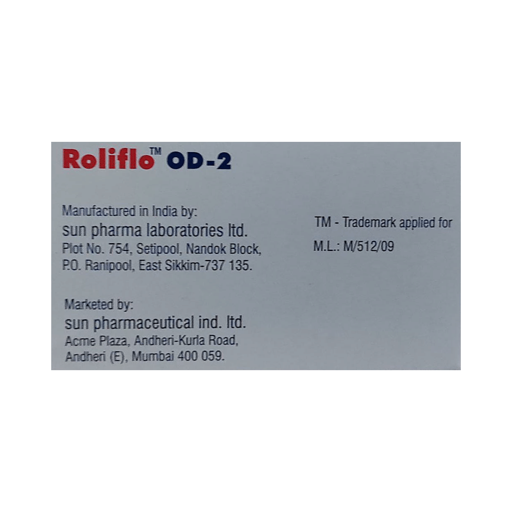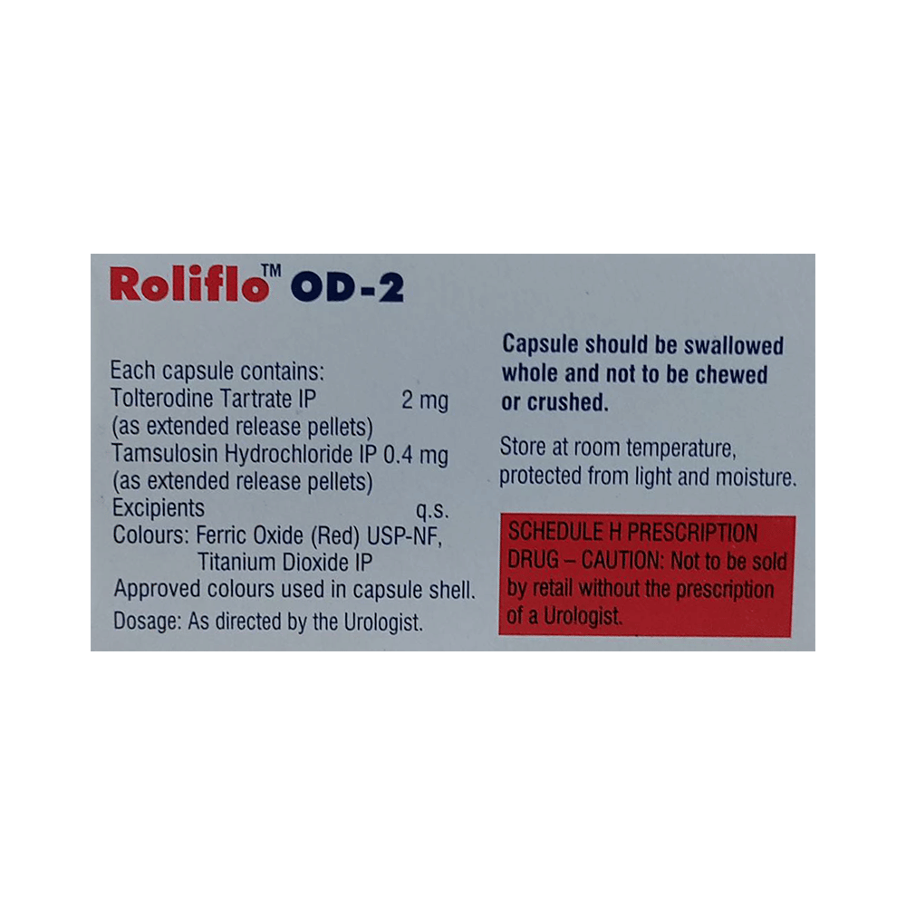 roliFLO OD 2mg Capsule ER is a combination of two medicines. It is used in the treatment of benign prostatic hyperplasia. It helps relax the muscles of the bladder and prostate gland, thereby relieving pain and irritation while urinating. It also helps control the urge to urinate. roliFLO OD 2mg Capsule ER may be prescribed alone or in combination with other medicines. roliFLO OD 2mg Capsule ER may be taken with or without food. Take it regularly and take it at the same time each day for the best result. Do not use it for a longer duration than recommended by your doctor. You should not stop taking the medicine until your doctor tells you it is okay to stop.Using this medicine may cause a few common side effects such as blurred vision, dizziness, and headache. If you experience any of these side effects that do not go away or get worse, let your doctor know. Your doctor may help with ways to reduce or prevent the side effects.To make sure the medicine is safe for you, before taking this medicine, let your doctor know all the other medicines you are taking. Let your doctor also know if you have any problems with your heart, liver, or kidneys. Pregnant or breastfeeding women should consult their doctor before taking roliFLO OD 2mg Capsule ER to ensure safety.