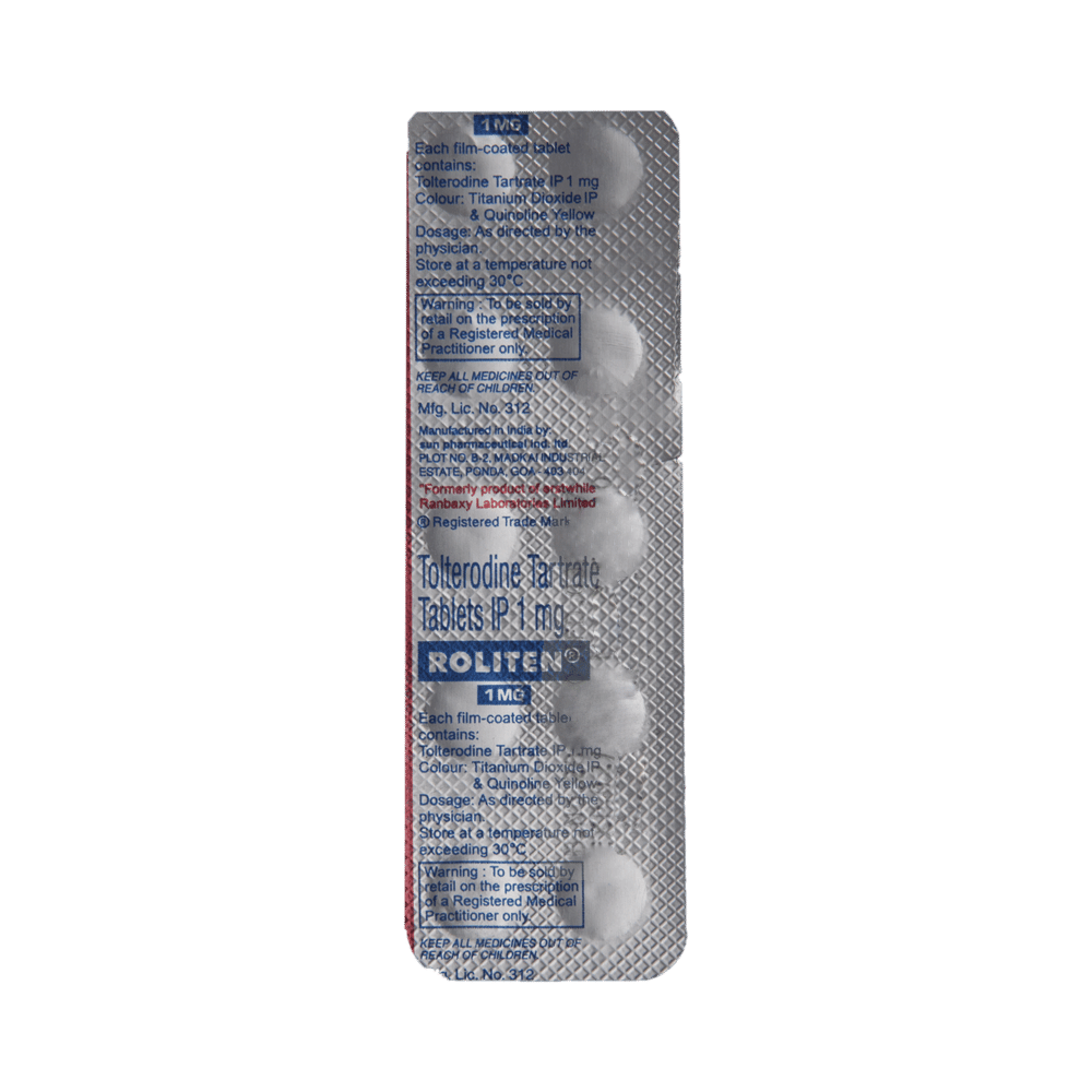 roliTEN 1mg Tablet is used in the treatment of overactive bladder. It relieves urinary symptoms like frequent urination, urgent need to urinate, and inability to control urination. roliTEN 1mg Tablet is advised to take it in a dose and duration as per prescription. It can be taken with or without food, but take it at the same time regularly. Swallow the medicine as a whole without crushing or chewing it. You should not stop taking the medicine without consulting the doctor as it may lead to the worsening of your symptoms. The course of the treatment should be completed for better efficacy of the medicine.Some common side effects of this medicine include dry mouth, constipation, diarrhea, urinary retention, and headache. Drinking plenty of water might help you cope up with the side effects. It may also make you feel dizzy or sleepy or make your vision blurry, so it advised not to drive or do anything requiring concentration until you know how it affects you. Consumption of alcohol must be avoided as it can aggravate the side effects. If any of the side effects bother you or persist, consult the doctor without delay.Before receiving the treatment, inform your doctor if you are on any medication for any other health conditions. You should also inform your doctor if you are pregnant or breastfeeding. Patients with liver or kidney disease must be cautious while receiving the prescription and they must receive regular follow-ups as per the doctor’s advice.
