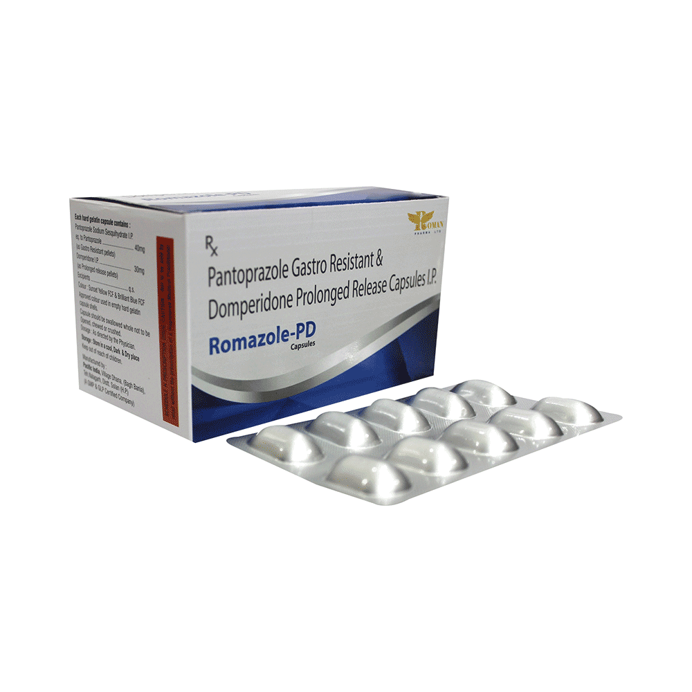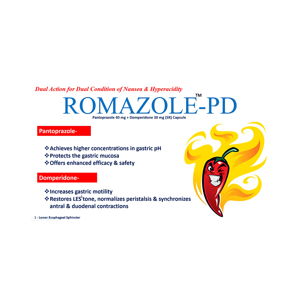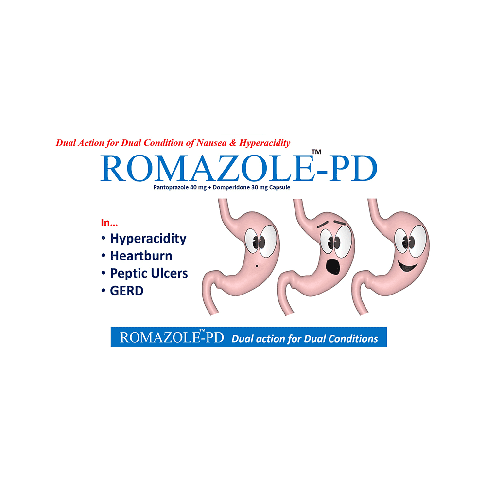 Romazole PD 30mg/40mg Capsule SR is a medicine that is used to treat conditions like acid reflux disease (GERD), erosive esophagitis, gastritis, gastric and duodenal ulcers, and indigestion with symptoms like heartburn, bloating, and regurgitation. It works by lowering acid production and helping the stomach empty faster. Take Romazole PD 30mg/40mg Capsule SR exactly as prescribed by your doctor, usually once daily before breakfast. Swallow it whole with water; do not crush or chew. To get the best results, maintain a healthy diet, avoid late-night meals, caffeine, spicy or oily foods, and stop smoking or alcohol use. Do not skip doses or stop early, even if you feel better, as that may lead to a return of the symptoms.The most common side effect of Romazole PD 30mg/40mg Capsule SR is dry mouth. It may also cause headache, dizziness, diarrhea, nausea, or mild stomach discomfort in some people. These are usually temporary. If you experience persistent vomiting, irregular heartbeat, rash, or severe diarrhea, contact your doctor immediately. Staying hydrated and taking the medicine before meals may help reduce stomach-related side effects.Inform your doctor about any liver, kidney, or heart problems before starting Romazole PD 30mg/40mg Capsule SR. Avoid taking it with other drugs that may affect heart rhythm or interact with domperidone or pantoprazole. Do not use it if you have a history of gastrointestinal bleeding or obstruction, or if you are allergic to any of the ingredients in the medicine. Pregnant or breastfeeding women should consult their doctor before use.