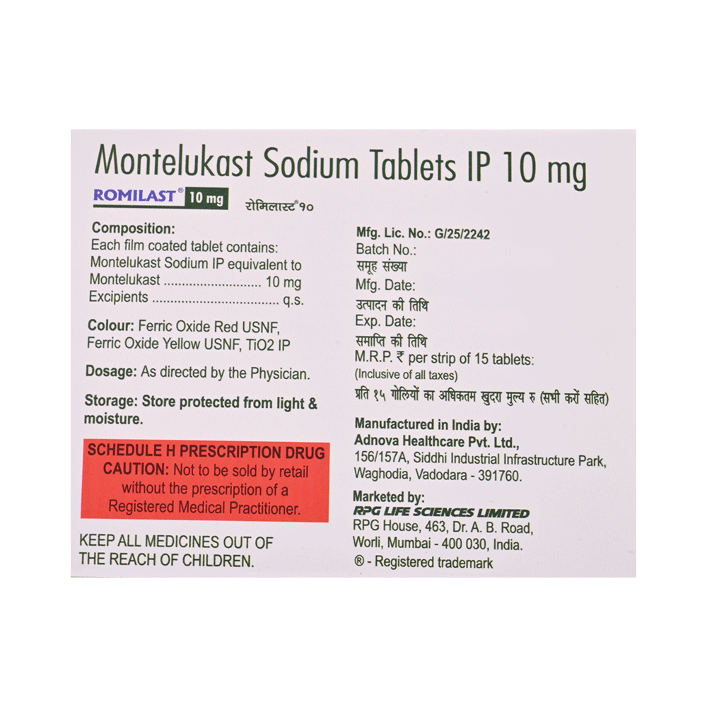 Romilast 10mg Tablet is a prescription medicine used for asthma prevention and for the treatment of allergy symptoms such as sneezing and runny nose. It reduces inflammation in the airways and makes breathing easier. Romilast 10mg Tablet can be taken with or without food. Take it at the same time to get the most benefit. It is advised to have it 2 hours before exercise if you have exercise-induced asthma. It should be taken as your doctor's advice. The dose and how often you take it depends on what you are taking it for. Your doctor will decide how much you need to improve your symptoms. You should take this medicine for as long as it is prescribed for you. It does not cure sudden breathing problems, so always carry a medicated inhaler with you. It is generally safe medicine with few common side effects include nausea, vomiting, headache, abdominal pain, and diarrhea. If these bother you or appear serious, let your doctor know. There may be ways of reducing or preventing them. Generally, you should avoid alcohol while taking this medicine.Before taking this medicine, you should tell your doctor if you have ever had severe liver problems. Your doctor should also know about all other medicines you are taking as many of these may make this medicine less effective or change the way it works. You must inform your doctor about pregnancy or breastfeeding.