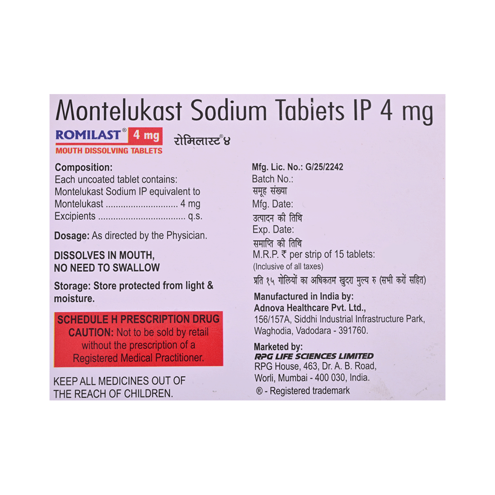 Romilast 4mg Tablet is used to prevent asthma attacks in children. It may also be used to ease breathing difficulties caused by strenuous physical activities. This medicine also helps treat symptoms of skin and seasonal allergies, such as a runny nose, sneezing, itching, swelling, congestion, and watery eyes. Give Romilast 4mg Tablet to your child at a fixed time before or after food in the prescribed dose, time, and way. Your child may start to feel better after a few regular doses. However, you must still complete the treatment to ensure maximum benefit. Moreover, stopping the medicine abruptly may worsen your child’s condition.Romilast 4mg Tablet may cause some minor and temporary side effects like fever, headache, abdominal pain, and diarrhea. Usually, these side effects subside once your child’s body adapts to the medicine. However, in case these effects persist or start bothering your child, consult your child’s doctor without any delay.Let your child’s doctor know if your child is already taking any medicines. Also, narrate your child’s complete medical history, including any prior episodes of allergy, heart problems, blood disorders, vascular disorders, birth defects, airway obstruction, lung anomaly, skin disorder, liver impairment, and kidney malfunction. This information is critical for adjusting doses and planning your child's treatment.