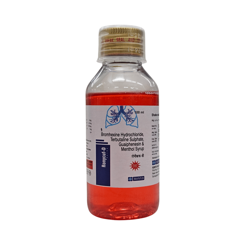 Ronycuf-D Syrup Sugar Free is used in the treatment of cough. It thins mucus in the nose, windpipe and lungs, making it easier to cough out. It also produces a sensation of coolness and relieves minor throat irritation. Ronycuf-D Syrup Sugar Free is taken with or without food in a dose and duration as advised by the doctor. The dose you are given will depend on your condition and how you respond to the medicine. You should keep taking this medicine for as long as your doctor recommends. If you stop treatment too early your symptoms may come back and your condition may worsen. Let your doctor know about all other medications you are taking as some may affect, or be affected by this medicine.The most common side effects are nausea, indigestion, bloating, vomiting, diarrhea, stomach pain, headache, sweating, skin rash, tremors, and increased heart rate. Most of these are temporary and usually resolve with time. Contact your doctor straight away if you are at all concerned about any of these side effects. This medicine can also cause sleepiness, so do not drive or do anything that requires mental focus until you know how this medicine affects you. Avoid drinking alcohol while taking this medicine as it can make sleepiness worse.Never support self-medication or recommend your medicine to another person. It is beneficial to have plenty of fluids while taking this medication. Before taking this medicine, you should tell your doctor if you are pregnant, planning pregnancy or breastfeeding.