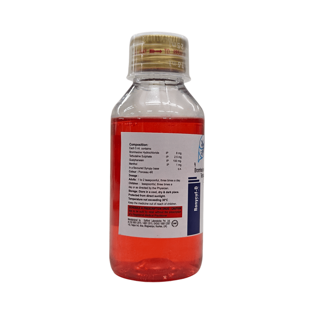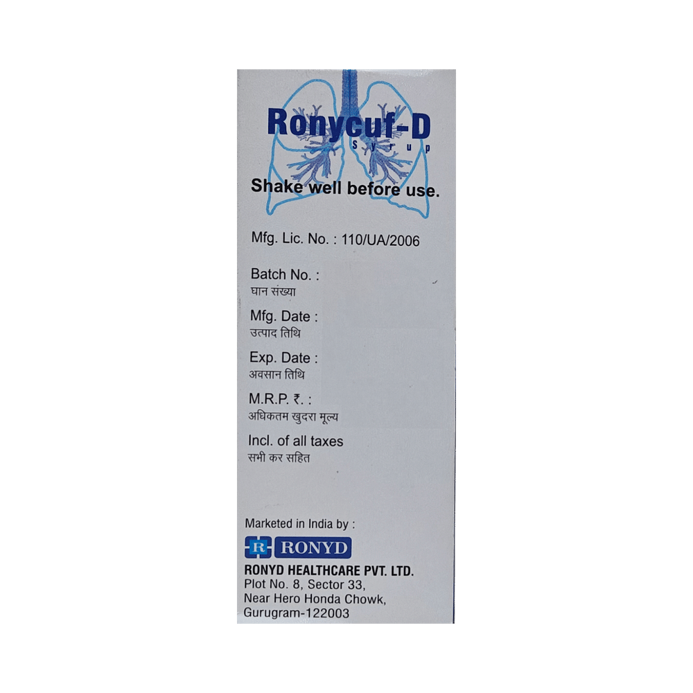 Take this medicine in the dose and duration as advised by your doctor. Check the label for directions before use. Measure it with a measuring cup and take it by mouth. Shake well before use. Ronycuf-D Syrup Sugar Free may be taken with or without food, but it is better to take it at a fixed time.
