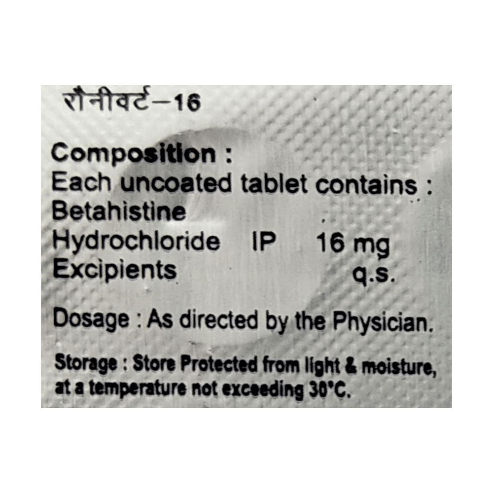 Ronyvert 16 Tablet is a histamine analog. It works by improving the blood flow in the inner ear which reduces the pressure of excess fluid there. Excess fluid can send signals to the brain causing nausea, dizziness or spinning sensations (symptoms of Ménière's disease). Ronyvert 16 Tablet additionally dampens down the nerve signals sent from the inner ear to the brain relieving the symptoms of Ménière's disease.