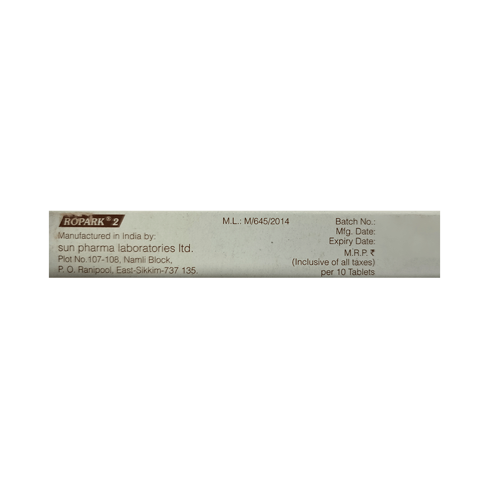 Ropark 2 Tablet is used in the treatment of Parkinson's disease and restless leg syndrome (an urge to move the legs usually accompanied or caused by uncomfortable and unpleasant leg sensations). It helps to treat excessive shaking by slowing down the body movements. Ropark 2 Tablet is taken by mouth preferably before bedtime with food to avoid nausea. However, take it at the same time each day as this helps to maintain consistent level of medicine in the body. Take this medicine in the dose and duration as advised by your doctor and if you have missed a dose, take it as soon as you remember it. You should never skip any doses and finish full course of treatment even if you feel better. It is important that this medication is not stopped suddenly without talking to doctor as may result in harmful effects.Some common side effects of this medicine includes headache, hallucination and confusion. Initially this medicine may cause sudden drop in the blood pressure when you change positions, so it is better to rise slowly if you have been sitting or lying down. It also causes dizziness and sleepiness, so do not drive or do anything that requires mental focus until you know how this medicine affects you. It is important to inform doctor if you develop any unusual changes in mood, an abnormally high sex drive, an urge to gamble or uncontrolled spending as these may prove very harmful.