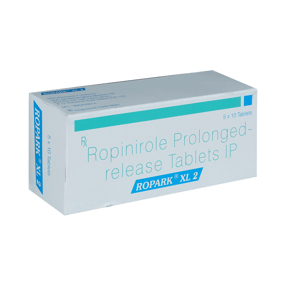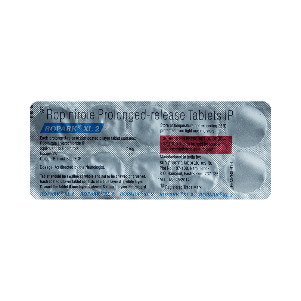 Ropark XL 2 Tablet is used in the treatment of Parkinson's disease and restless leg syndrome (an urge to move the legs usually accompanied or caused by uncomfortable and unpleasant leg sensations). It helps to treat excessive shaking by slowing down the body movements. Ropark XL 2 Tablet is taken by mouth preferably before bedtime with food to avoid nausea. However, take it at the same time each day as this helps to maintain consistent level of medicine in the body. Take this medicine in the dose and duration as advised by your doctor and if you have missed a dose, take it as soon as you remember it. You should never skip any doses and finish full course of treatment even if you feel better. It is important that this medication is not stopped suddenly without talking to doctor as may result in harmful effects.Some common side effects of this medicine includes headache, hallucination and confusion. Initially this medicine may cause sudden drop in the blood pressure when you change positions, so it is better to rise slowly if you have been sitting or lying down. It also causes dizziness and sleepiness, so do not drive or do anything that requires mental focus until you know how this medicine affects you. It is important to inform doctor if you develop any unusual changes in mood, an abnormally high sex drive, an urge to gamble or uncontrolled spending as these may prove very harmful.