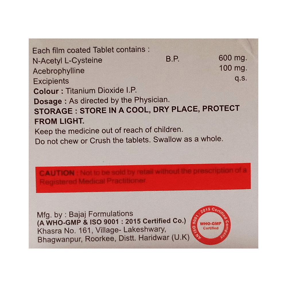 Salt Composition: Acebrophylline (100mg) + Acetylcysteine (600mg)