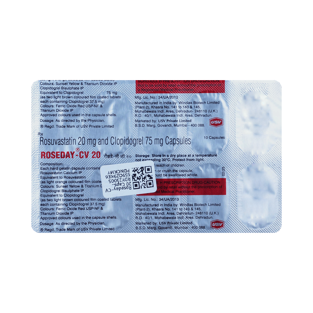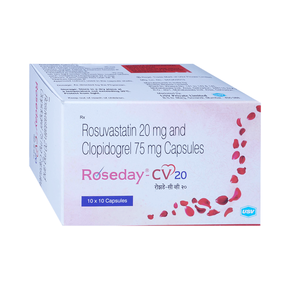 Roseday-CV 20 Capsule is a medicine used to prevent heart attack, angina, and stroke. This medicine reduces the "bad" cholesterol (LDL) and triglycerides (fats) levels. Moreover, it also decreases the formation of harmful blood clots and helps improve heart health. Roseday-CV 20 Capsule should be taken with or without food. You should take it regularly at evenly spaced intervals as per the schedule prescribed by your doctor. Taking it at the same time every day will help you remember to take it. The dose and duration of treatment will depend on what you are being treated for. Do not stop taking it until you have finished the complete course, even when you feel better. Incorporating healthy lifestyle changes like a low-fat diet, exercise, and not smoking can help this medicine work better.Common side effects of Roseday-CV 20 Capsule include stomach pain, constipation, nausea, muscle cramps, bleeding, and headache. These symptoms may vary from person to person. Inform the doctor if these symptoms get worse or last longer, and get medical advice if you experience any additional side effects.This medicine increases your risk of bleeding, so it is important to be careful while shaving, cutting nails, using sharp objects, or engaging in contact sports (e.g., football or wrestling). Let your doctor know if you notice yellowing of the skin, muscle pain, or dark urine.You may be asked to undergo regular monitoring of liver function while taking this medicine. Before taking this medicine, tell your doctor if you have liver or kidney disease or if you are suffering from a bleeding disorder. You must tell your doctor if you are pregnant, planning pregnancy, or breastfeeding. You should also let your doctor know all the other medicines you are taking, as they may affect or be affected by this medicine. Lifestyle changes like a low-fat diet, exercise, and not smoking may help this medicine work better.